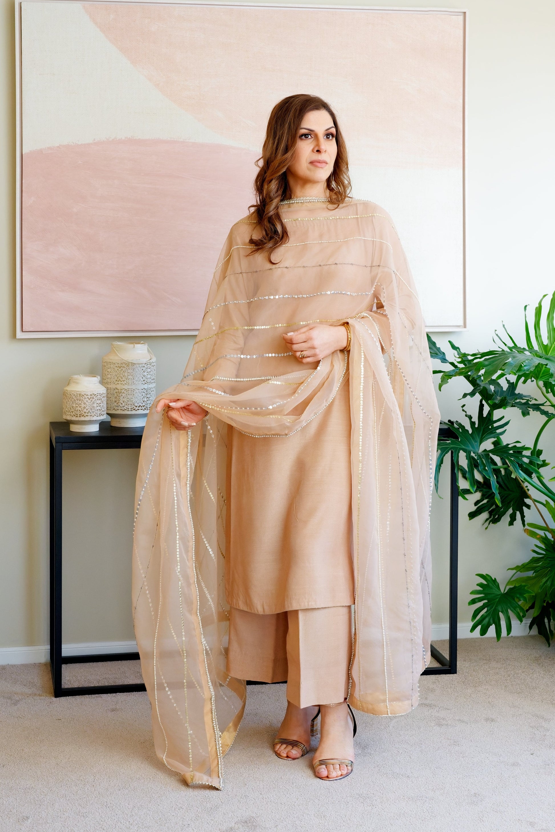 Get ready to be the centre of attention with a captivating, romantic ensemble featuring an abundance of signature Saffron details. Cut from the finest silk, this universally flattering ensemble is sure to become your forever favourite! The gorgeous apricot organza dupatta is intricately hand embroidered with sequins and pearls. Pair yours with our coordinating pants (as shown) and gold heels for an unforgettable look!