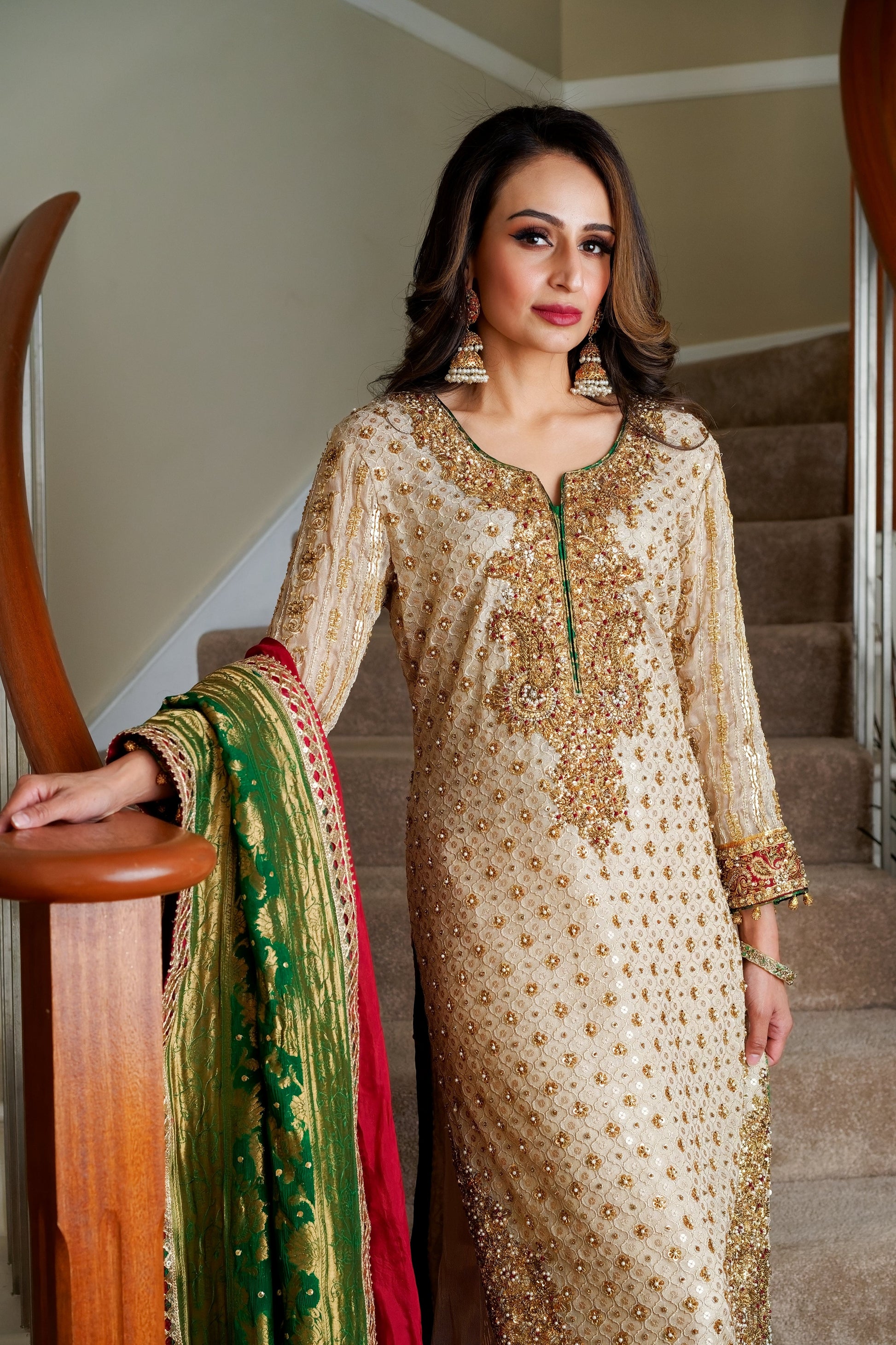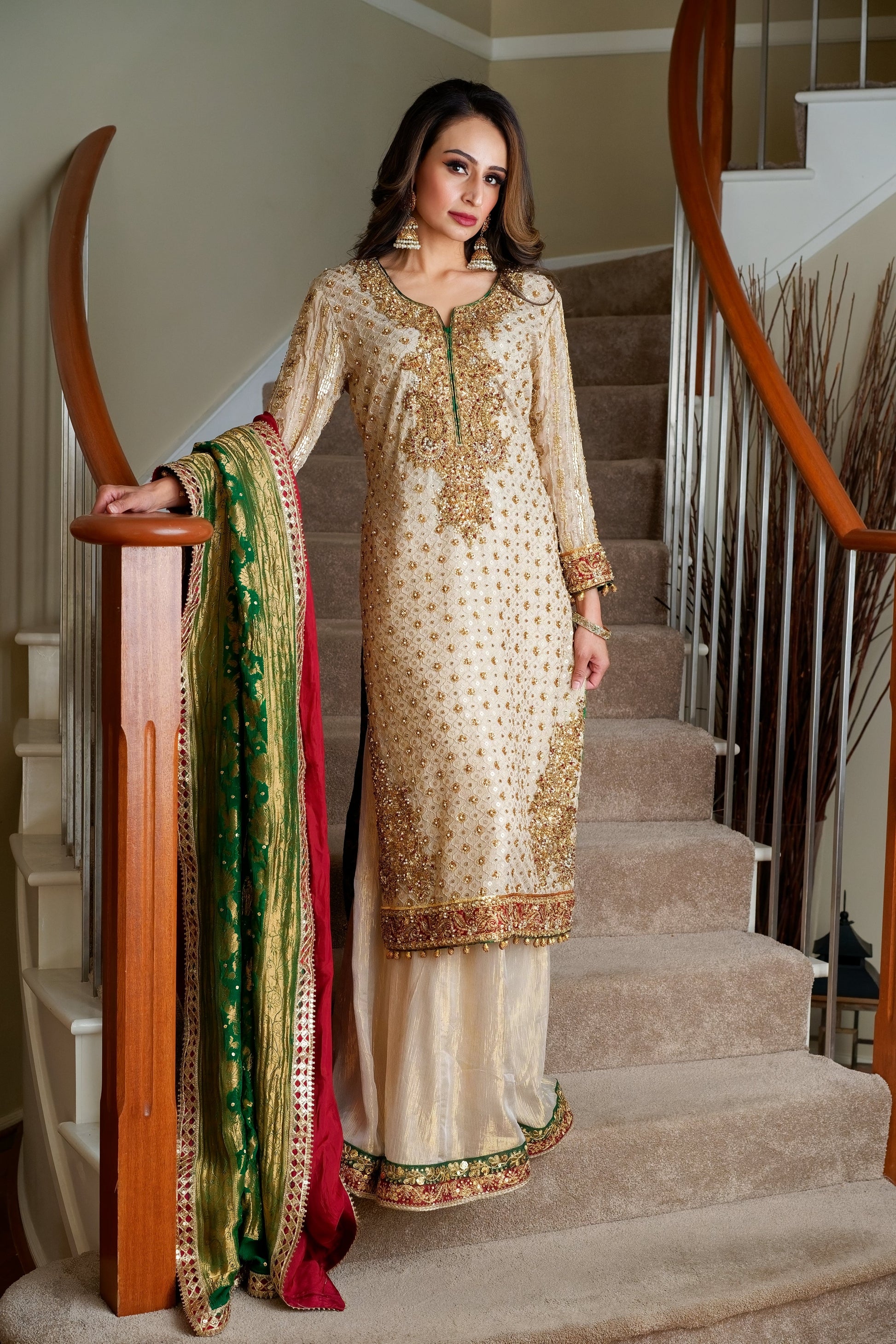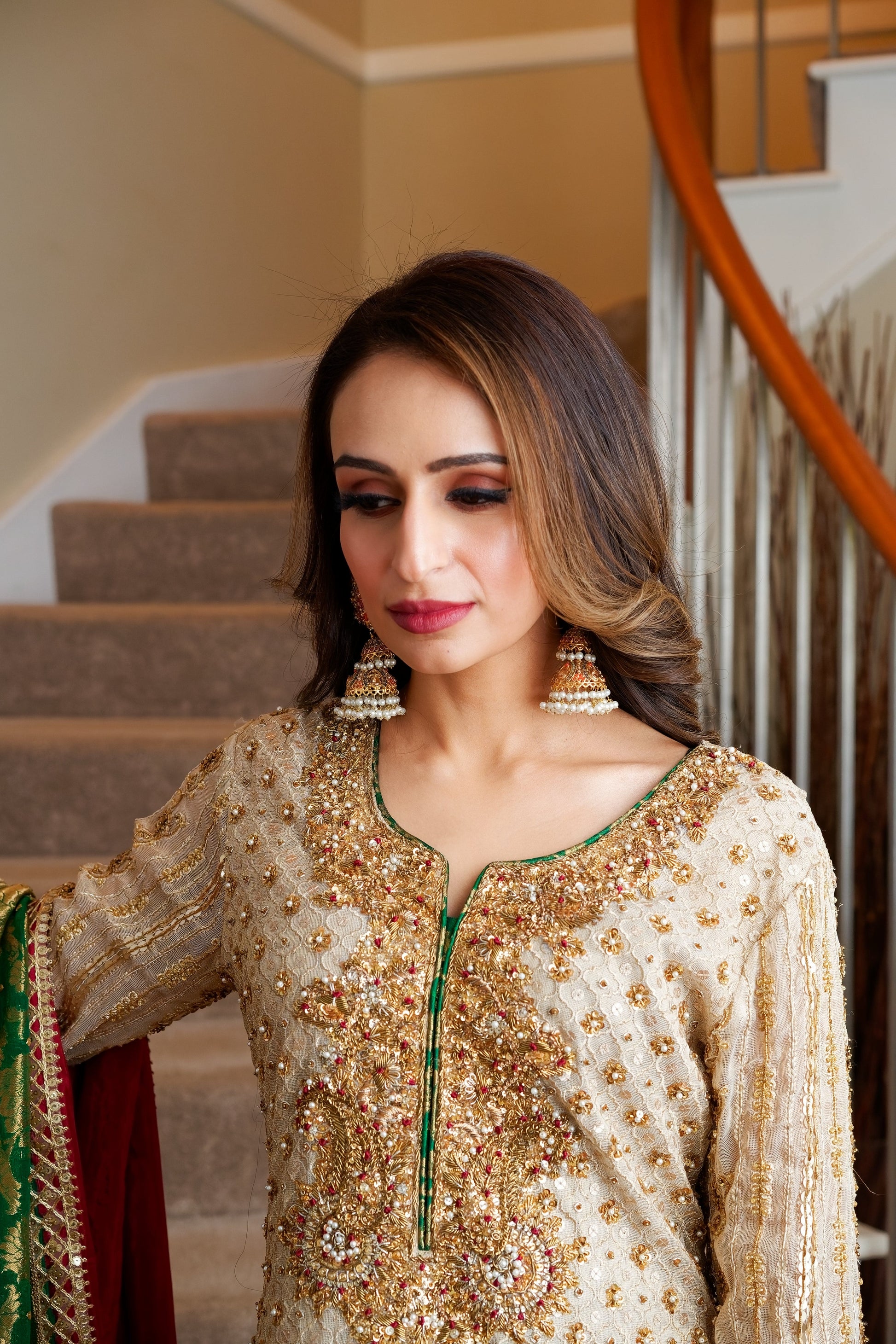 Saffron designs are the epitome of effortless style and this striking ensemble is no exception! This timeless elegance is intricately and heavily embroidered with tilla, zardozi, dabka and resham. The lehenga cut from finest gold maysoree and finished with burgundy and emerald green embellished borders adds a striking graceful flair. The regal look is completed with a banarsi chiffon doshala in the beautiful shades of emerald green and deep burgundy.