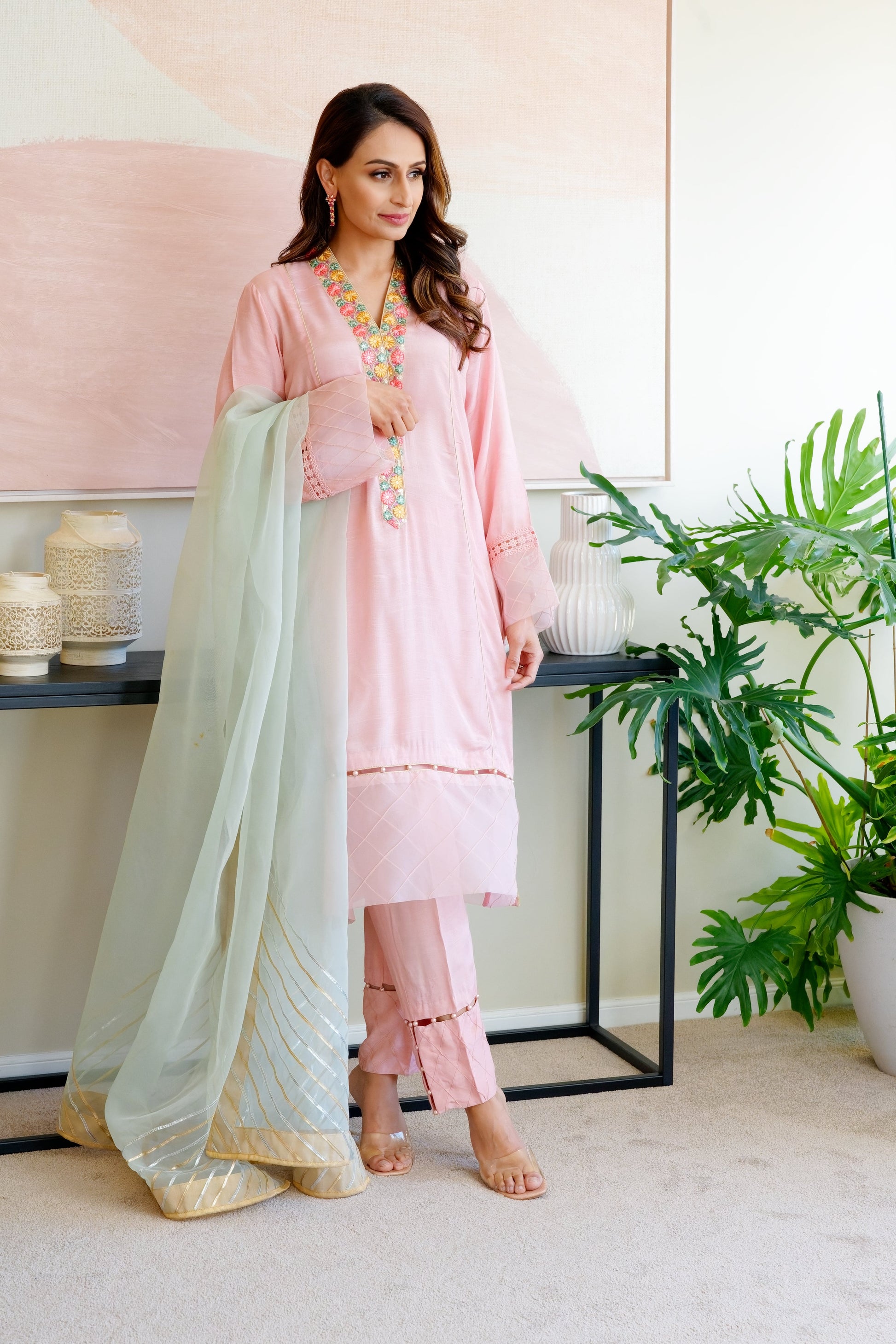 Irresistibly romantic florals, luxe fabrics and captivating details for the ultimate wardrobe refresh. The relaxed, much-loved silhouette has a universally flattering neckline, and is further enhanced with delicate floral embroidery. The sleeves and hem feature organza borders and lace detailing. A floaty and graceful organza dupatta with gota detailing, completes the look. Pair your outfit with our matching silk pants with pearl detailing (as shown) and minimal earrings for a stunning look, no matter the occasion.