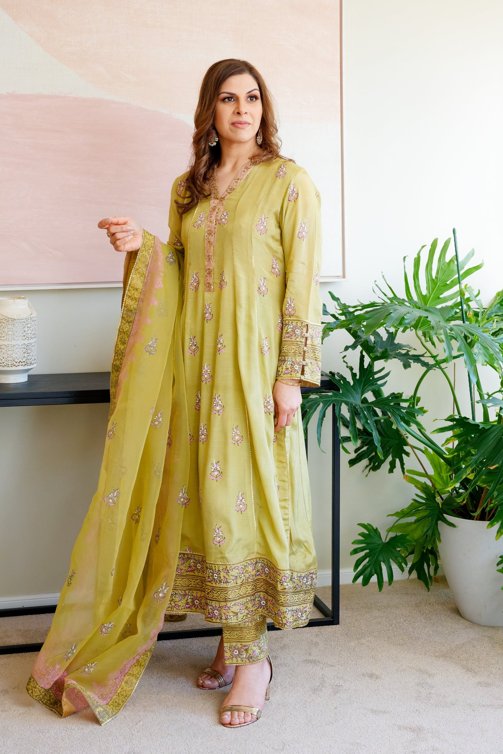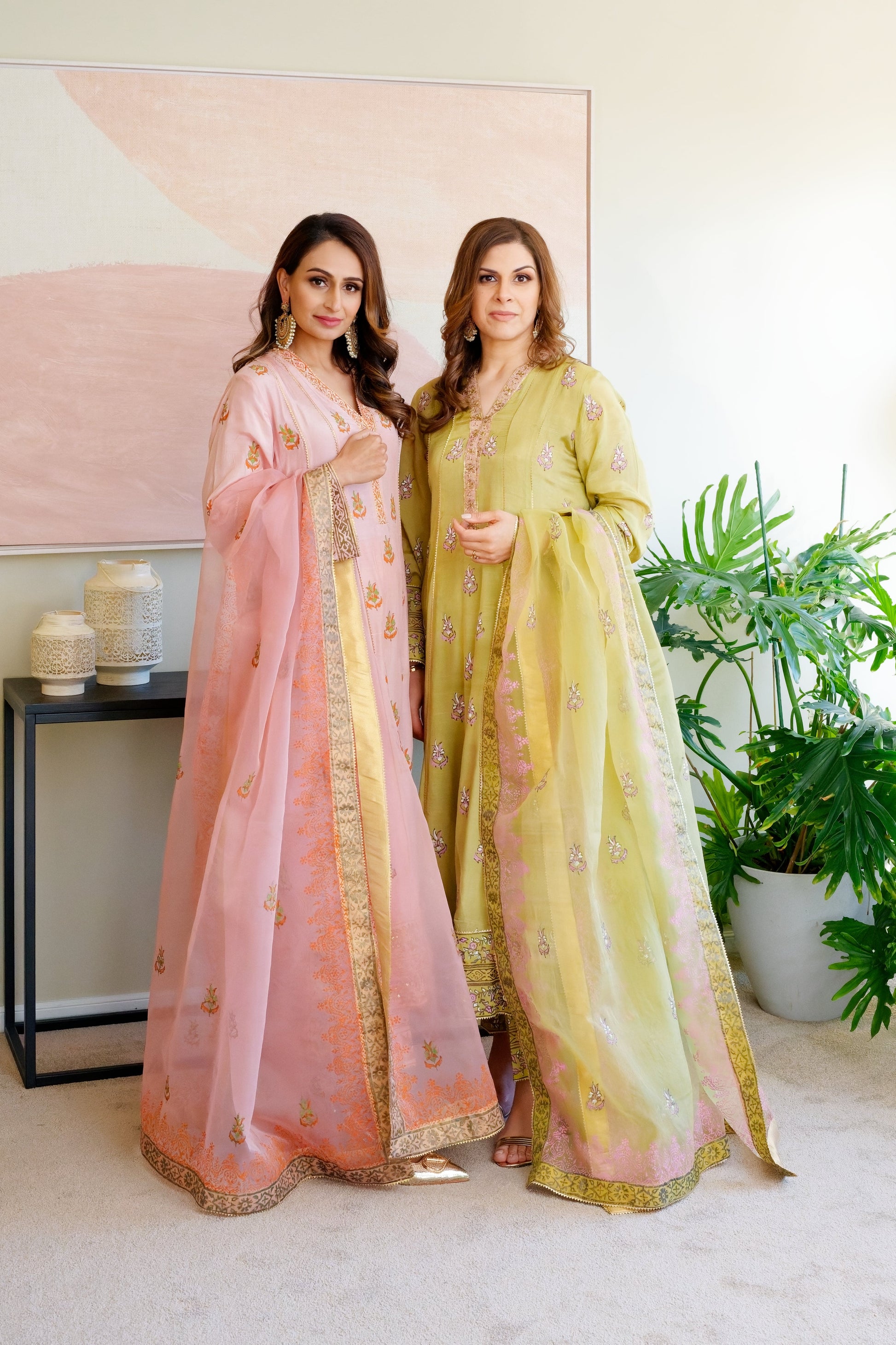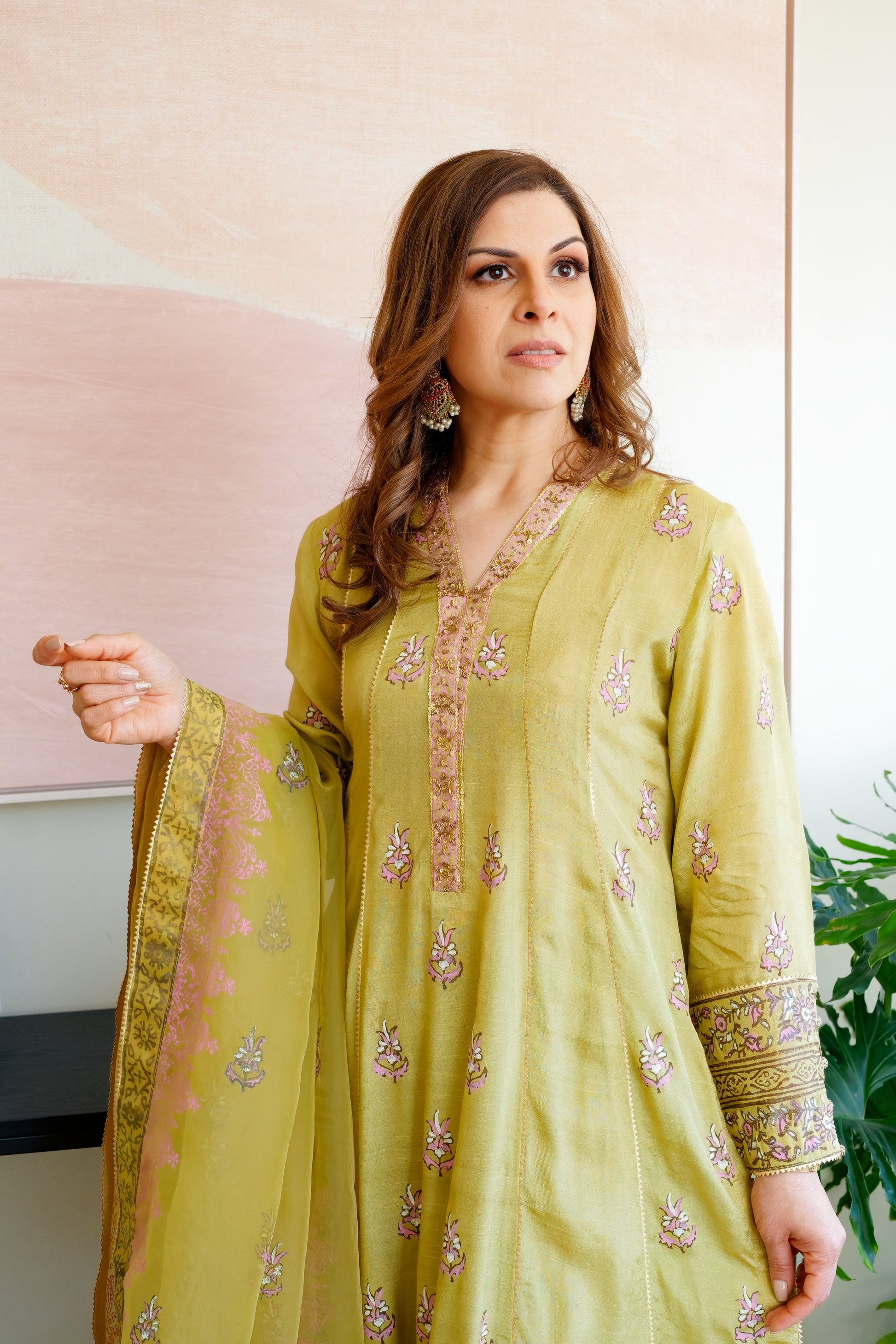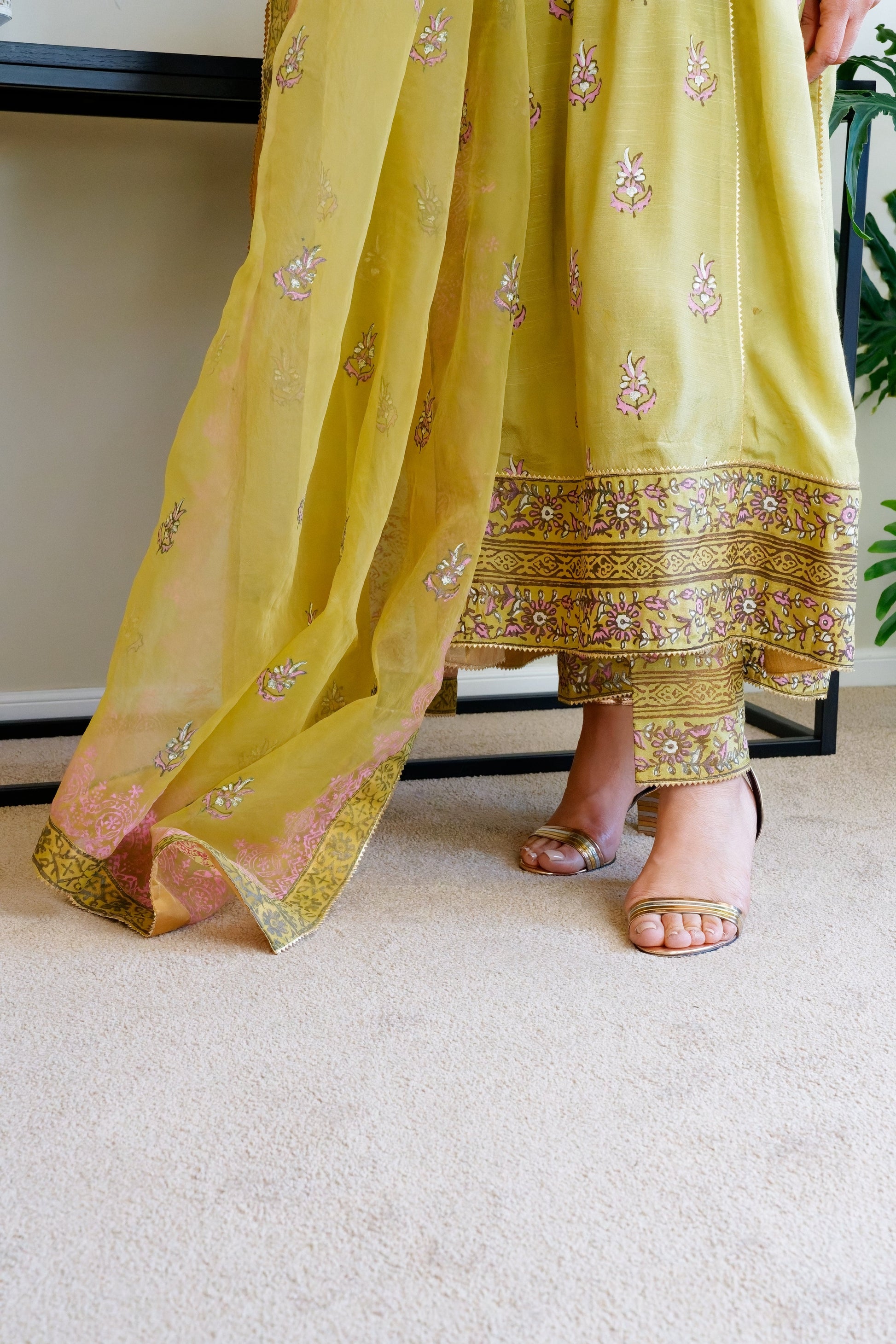 This ensemble is a nod to modern day glamour. Cut from silk in a warm hue, the impeccable tailoring and sleek lines of this ensemble will have you reaching for it whenever you really want to make an impact. Beautifully crafted, this kalidaar and dupatta strike the perfect balance between elegant and eye-catching. A timeless flowing silhouette, that will never go out of style is adorned with hand block printing and the neckline is further embellished with sitara and sequins