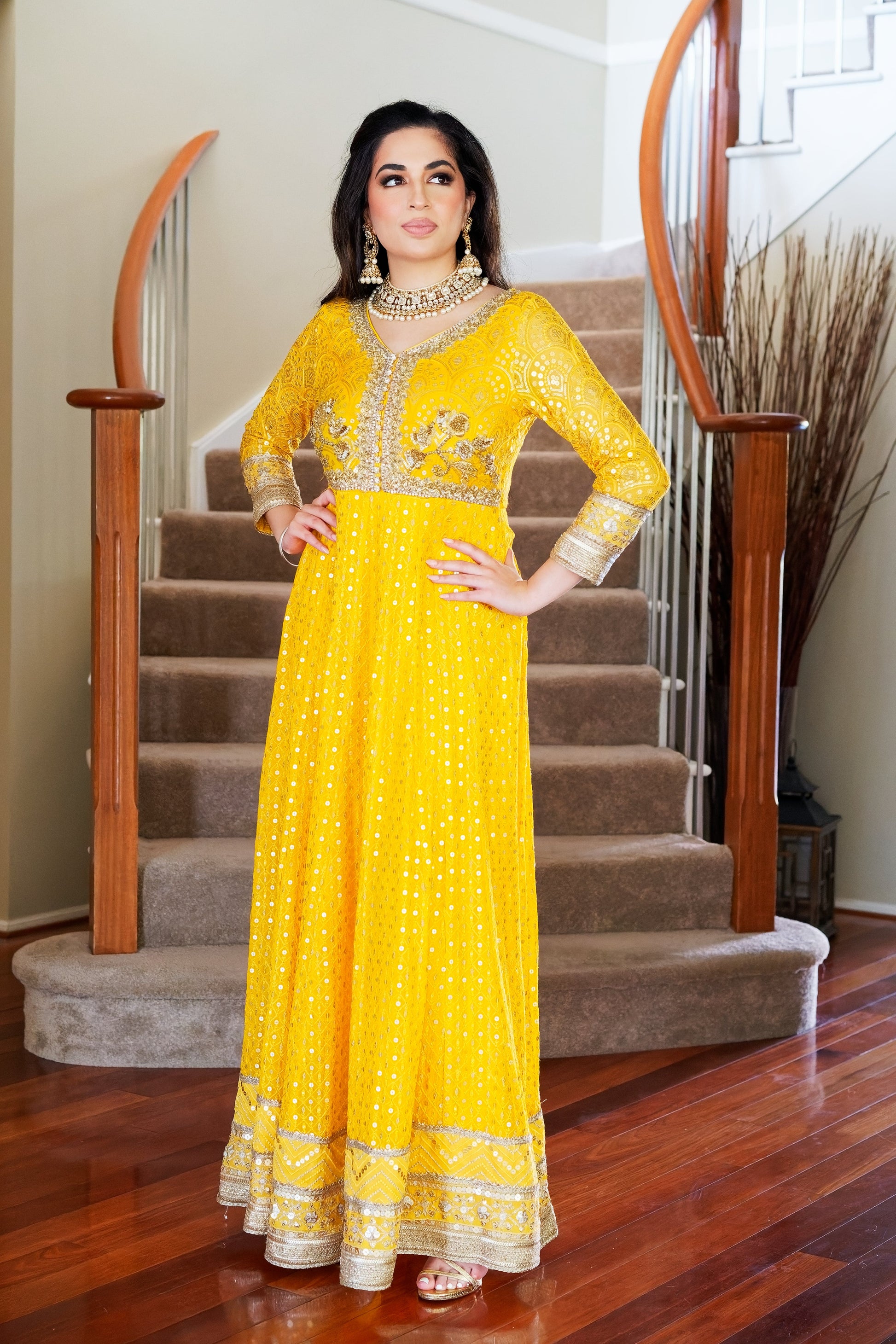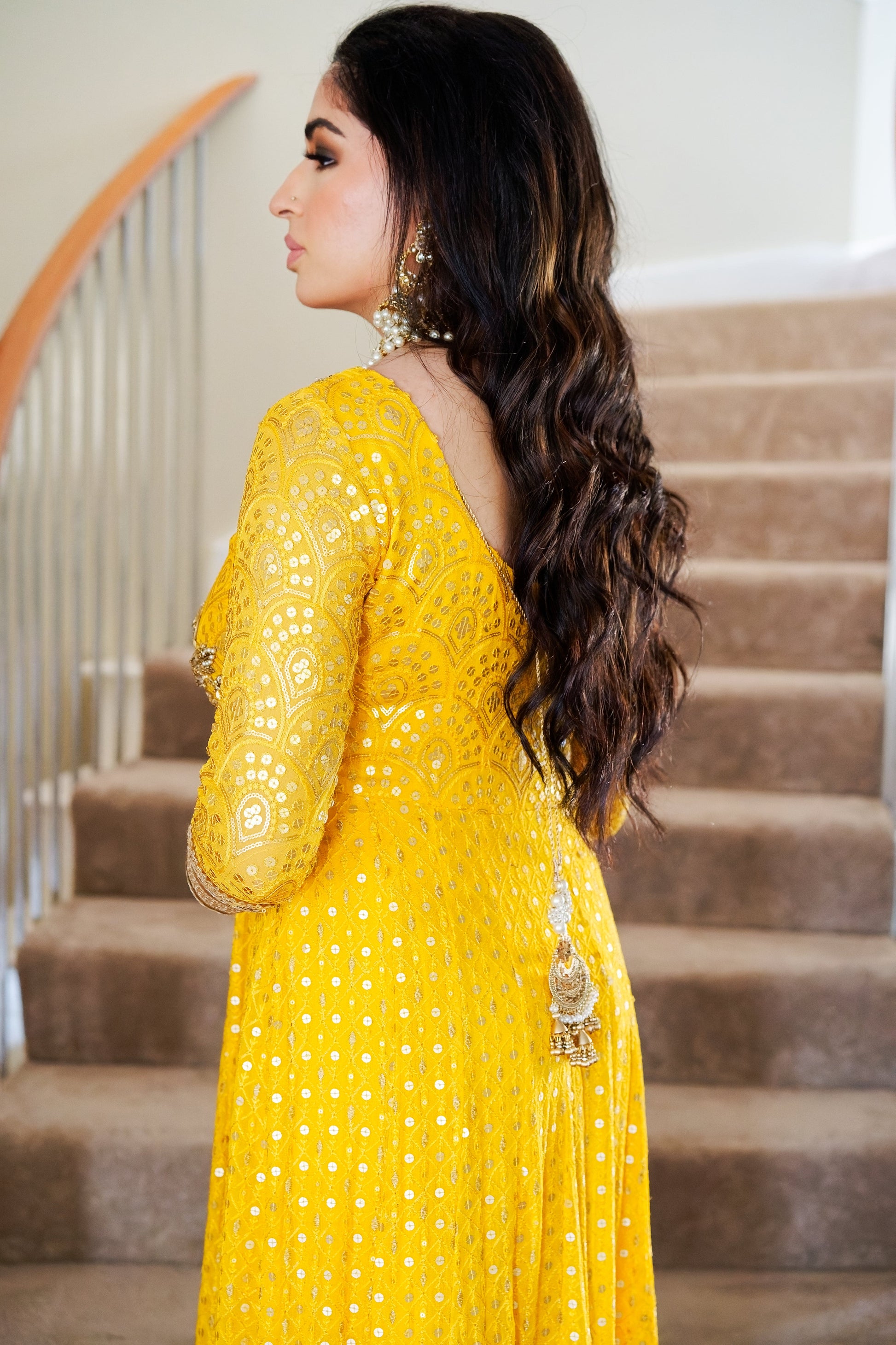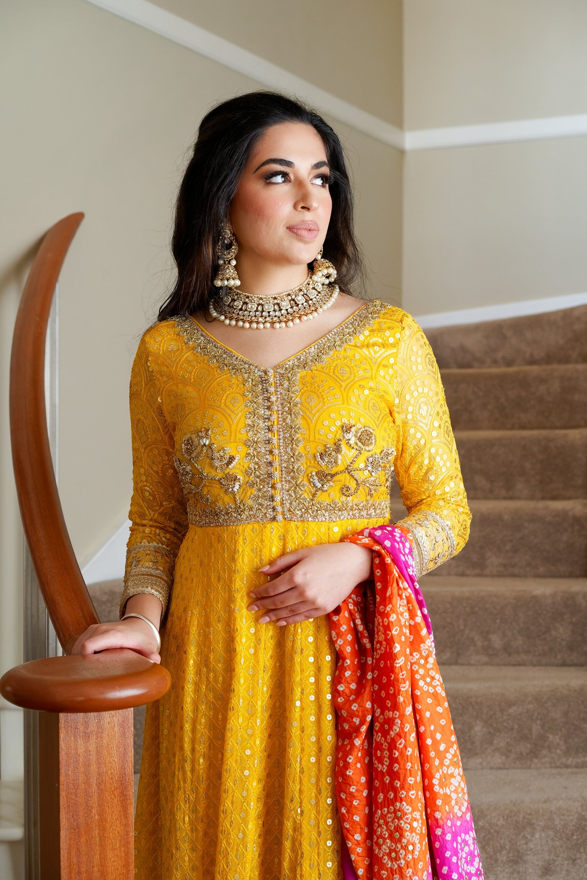 This classic canary yellow chikankari peshwas features a hand-worked heavily embellished bodice. Embroidered with dabka, kora and sequins, this ensemble is sure to turn around heads. Complete the look with a classic silk chunri dupatta in vibrant colours finished with gold detailing.