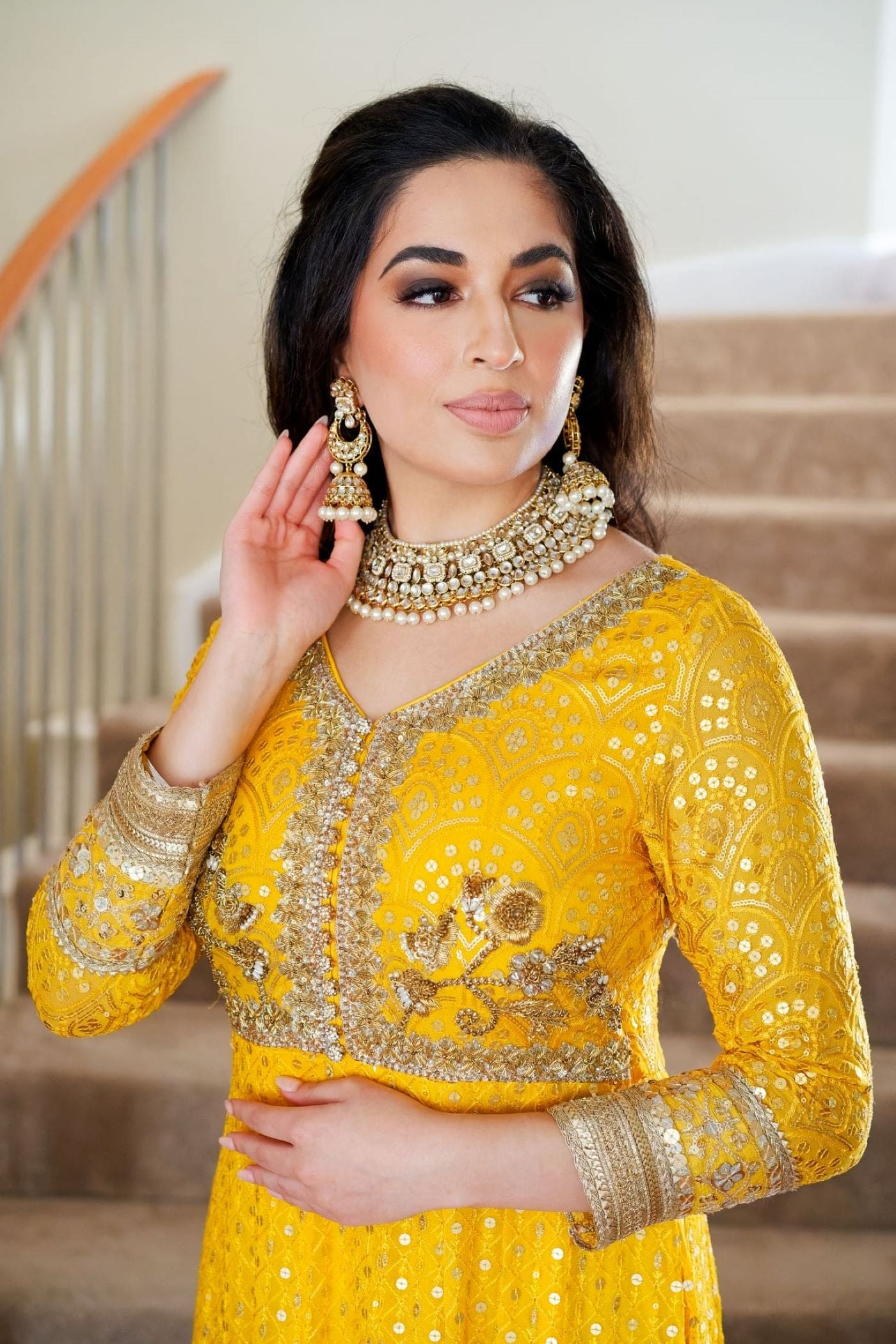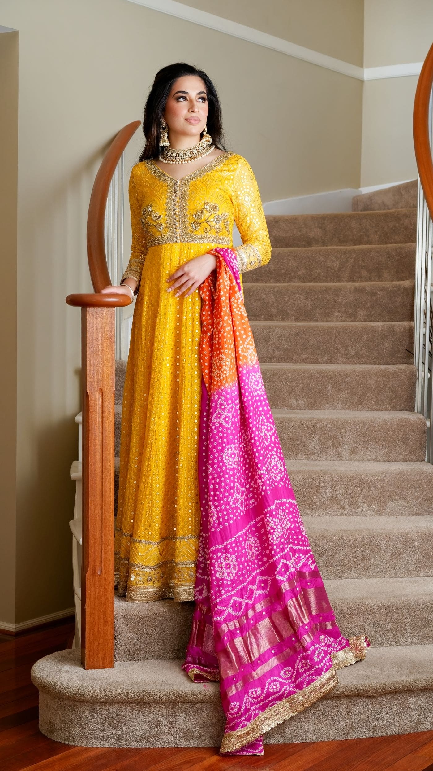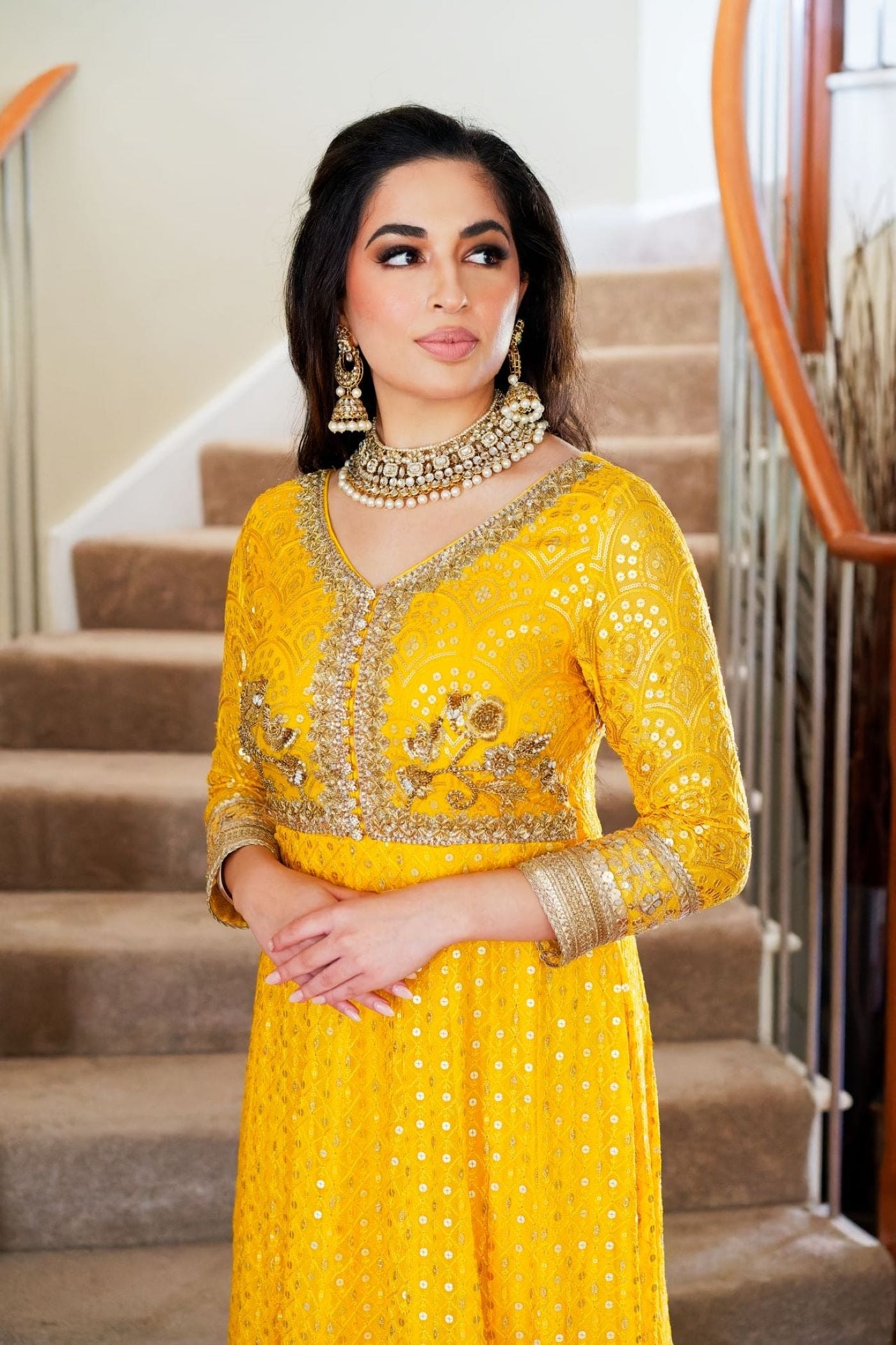 This classic canary yellow chikankari peshwas features a hand-worked heavily embellished bodice. Embroidered with dabka, kora and sequins, this ensemble is sure to turn around heads. Complete the look with a classic silk chunri dupatta in vibrant colours finished with gold detailing.