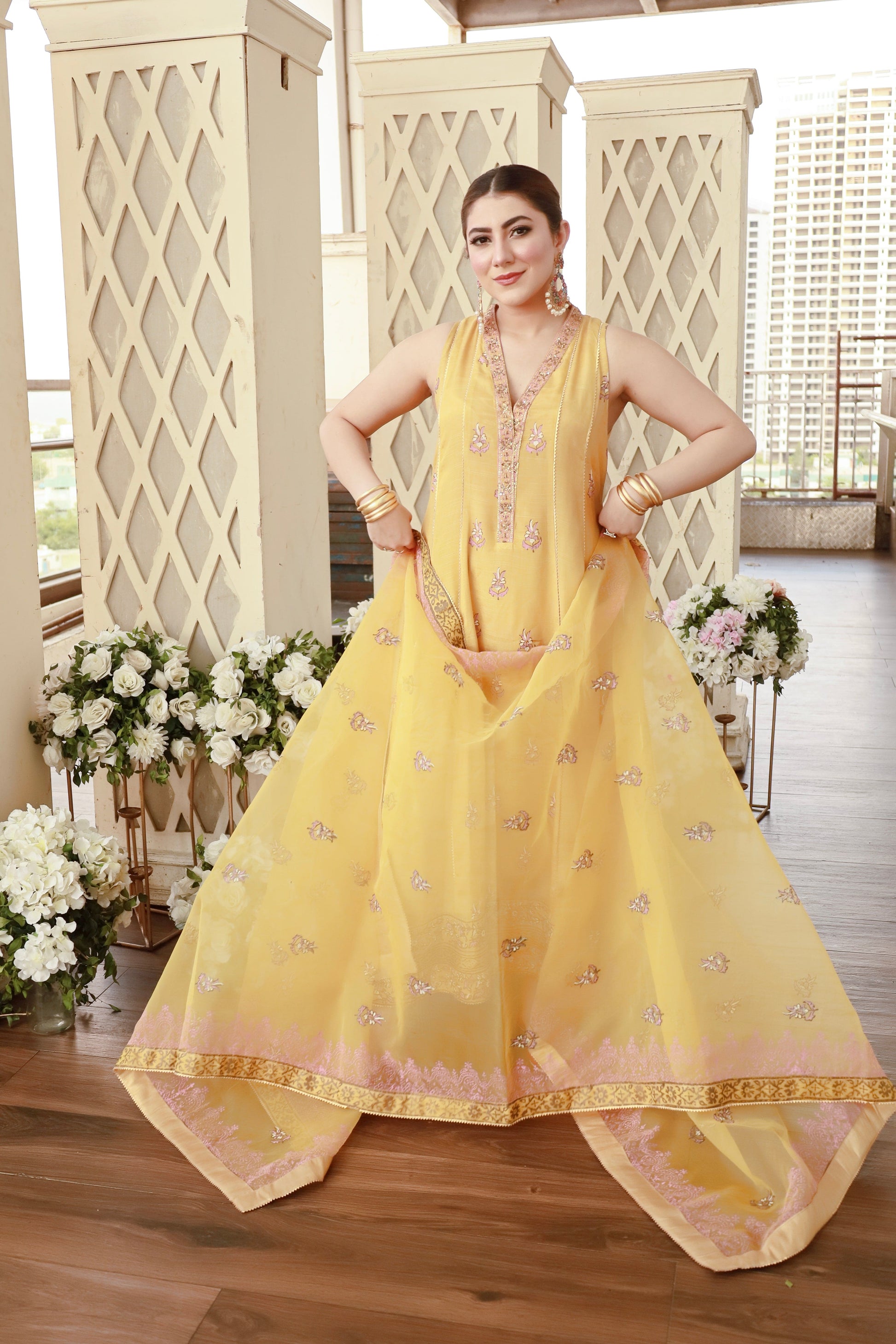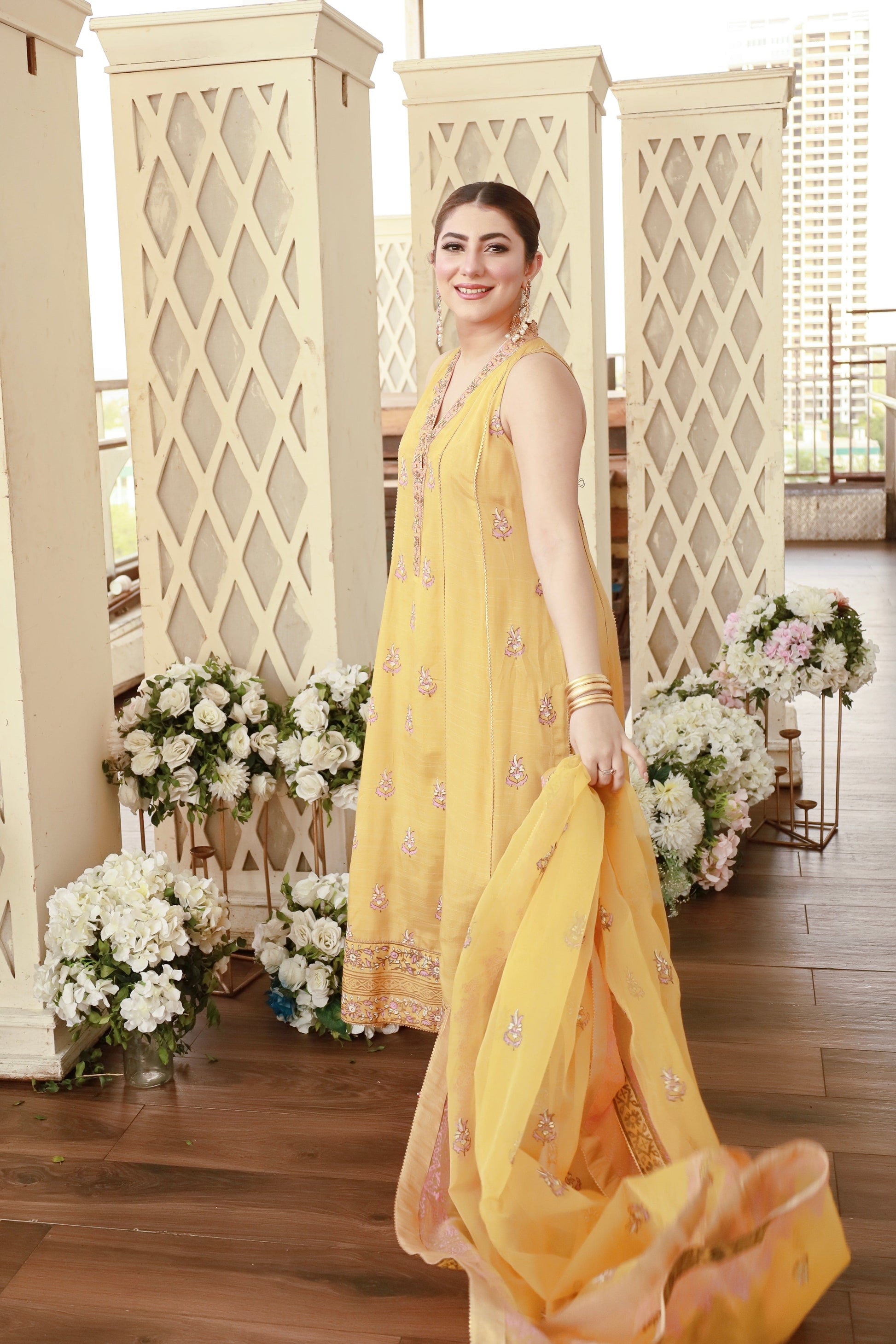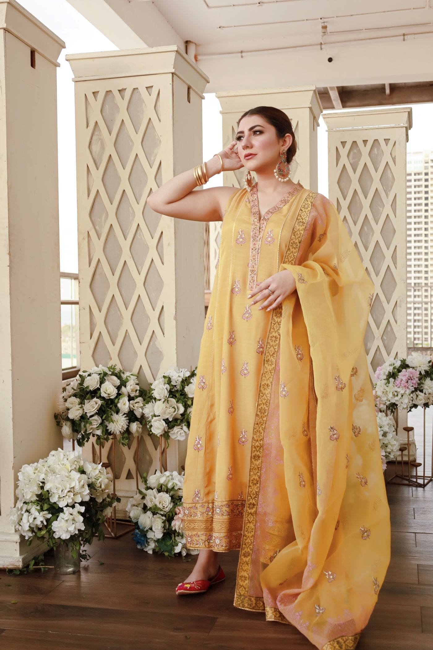 This ensemble is a nod to modern day glamour. Cut from silk in a warm hue the impeccable tailoring and sleek lines of this ensemble will have you reaching for it whenever you really want to make an impact! Beautifully crafted, this kalidaar and dupatta strike the perfect balance between elegant and eye-catching. A timeless flowing silhouette, that will never go out of style is adorned with hand block printing and the neckline is further embellished with sitara and sequins.