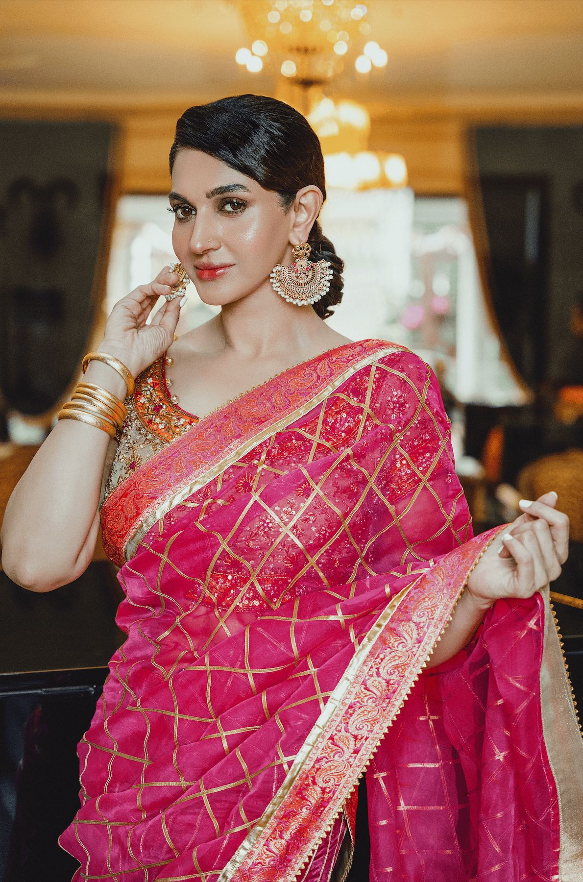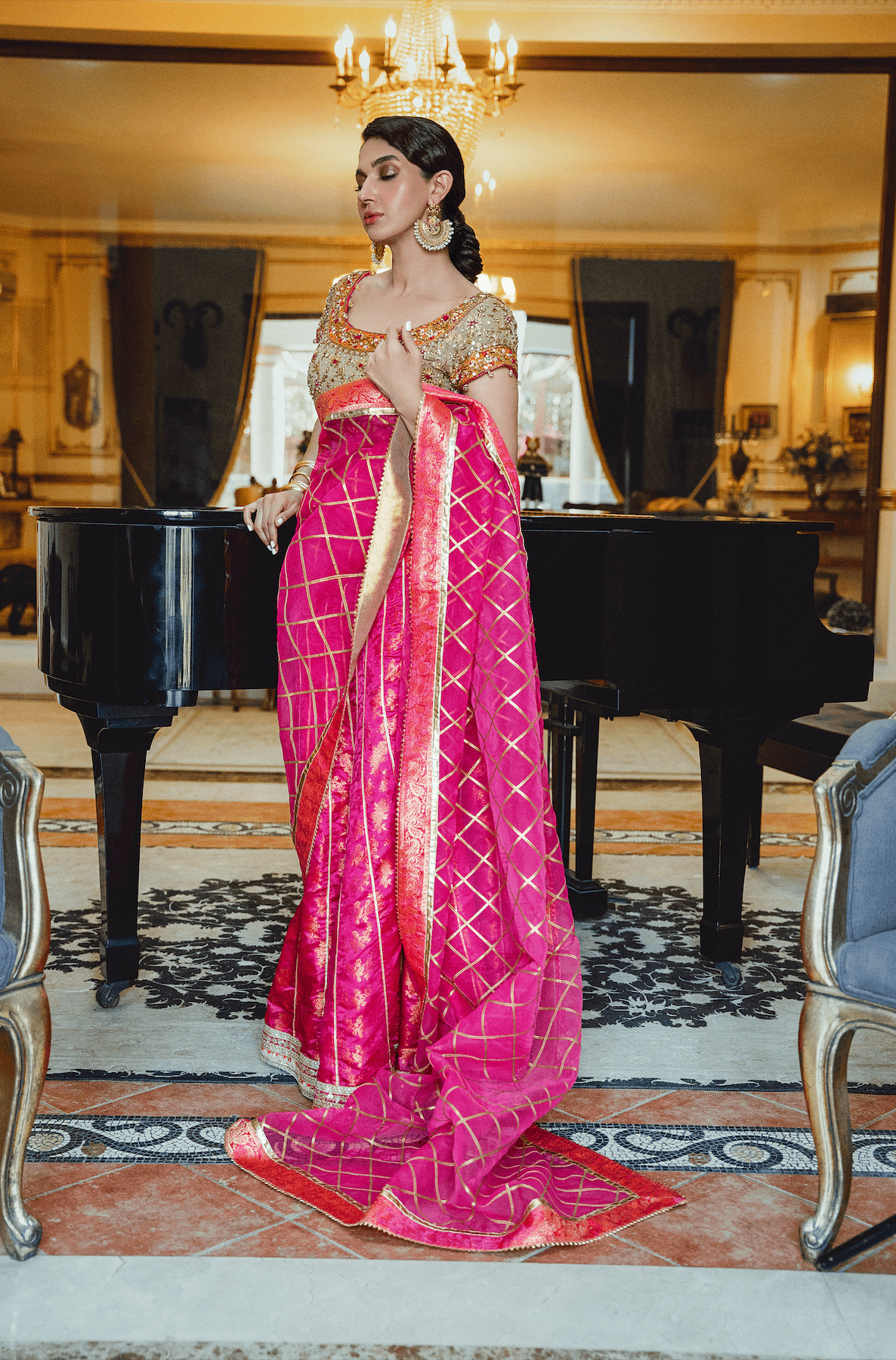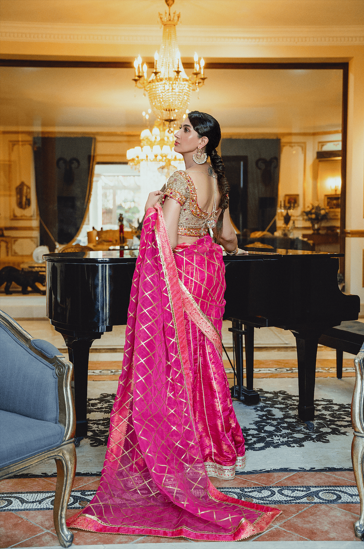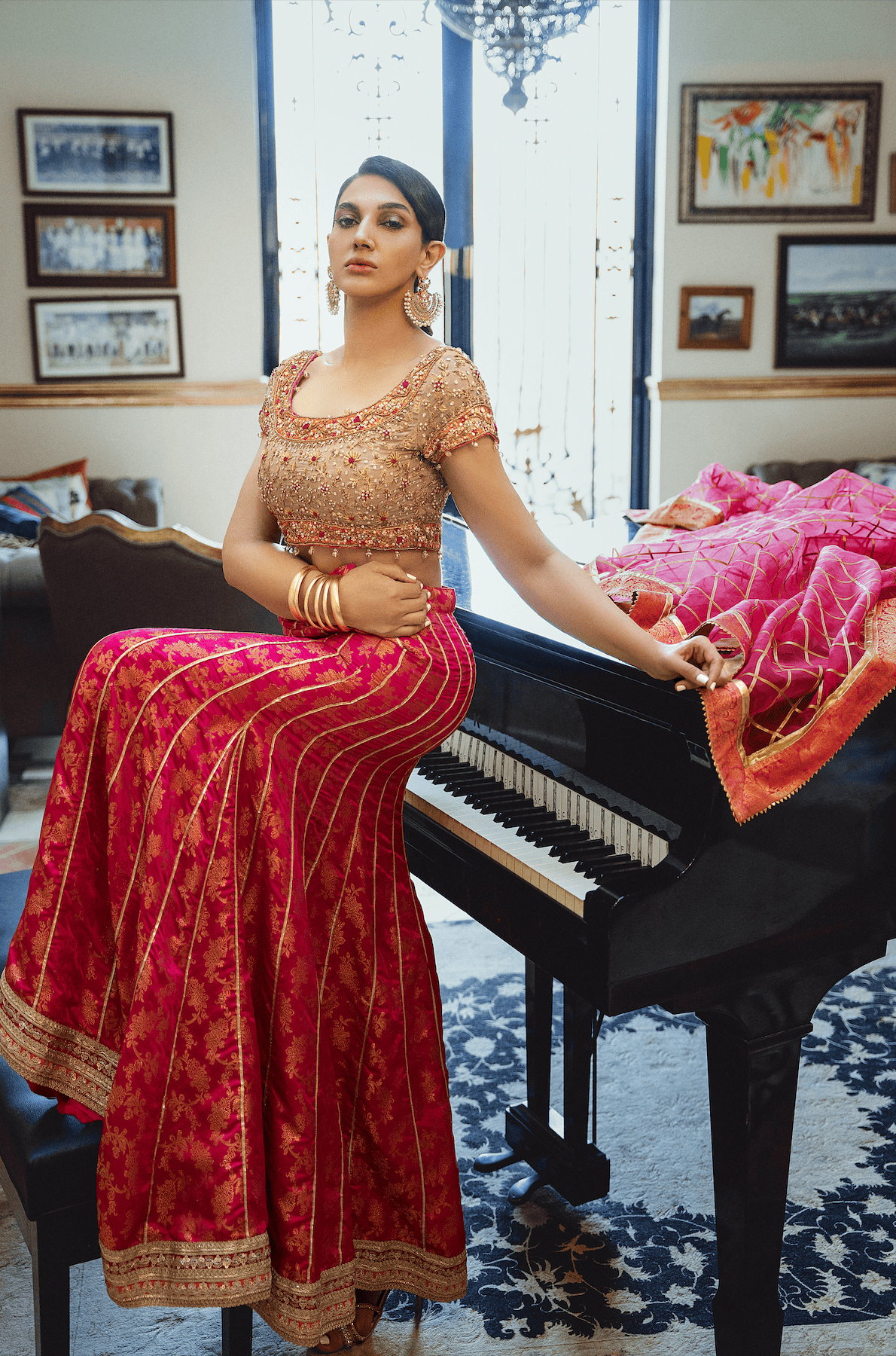 This head-turning ensemble is an amalgamation of vibrant hues and a modern silhouette. The gorgeous banarsi chiffon choli is intricately hand-embellished with dabka, tilla, naqshi and resham. The fuchsia pink panelled lehnga has a flattering silhouette with an embellished border. The organza dupatta with gota work completes the look.