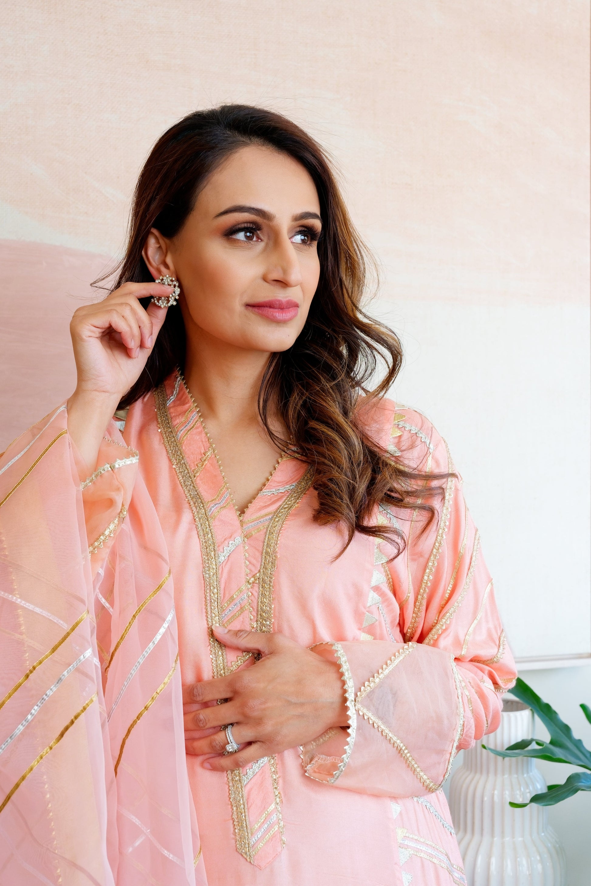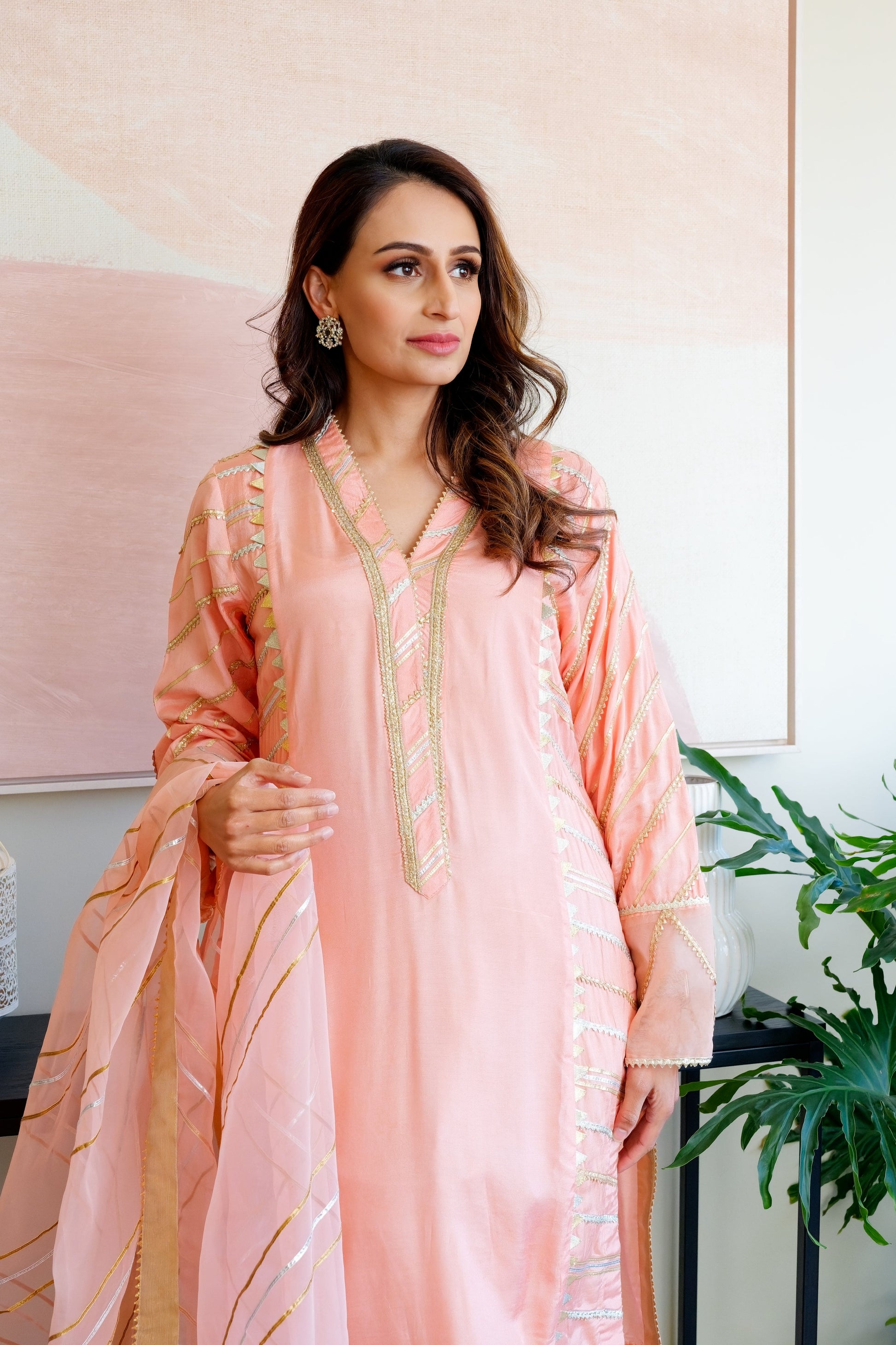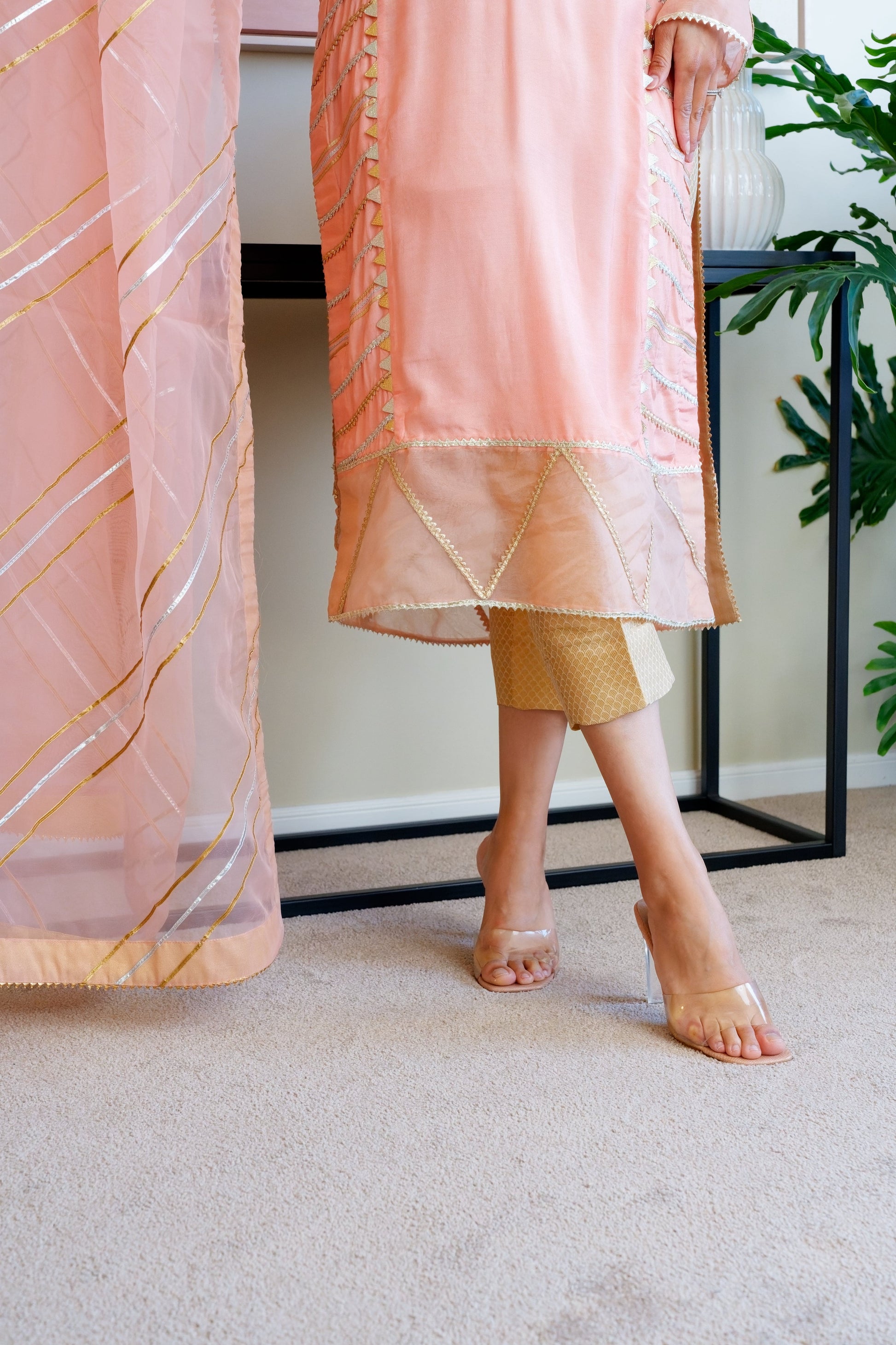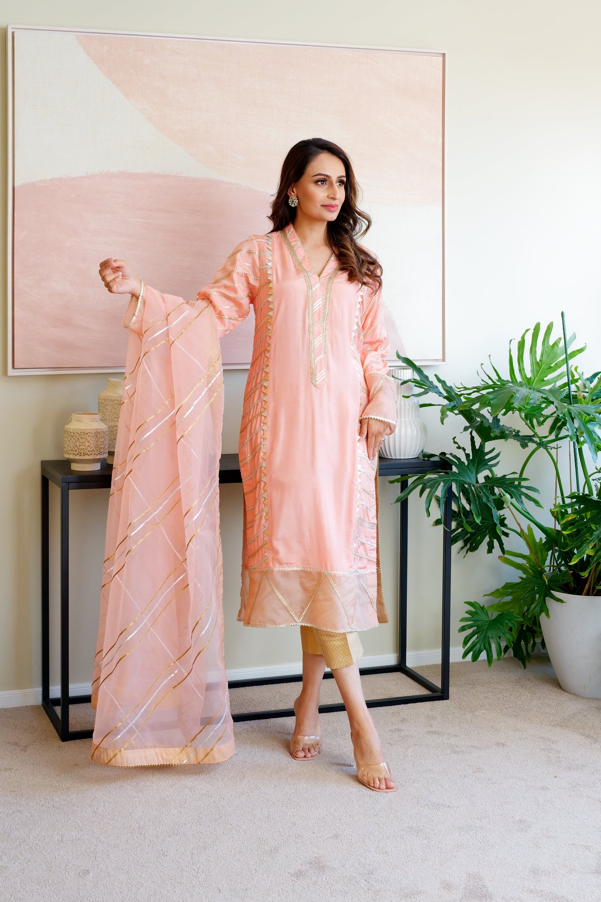 Cut from luxe silk, this universally flattering ensemble is sure to become your forever favourite! The relaxed, much-loved silhouette with a universally flattering neckline, is enhanced with gota and gold detailing. The sleeves and hem feature organza borders. A floaty graceful organza dupatta with gota and gold detailing completes the look.