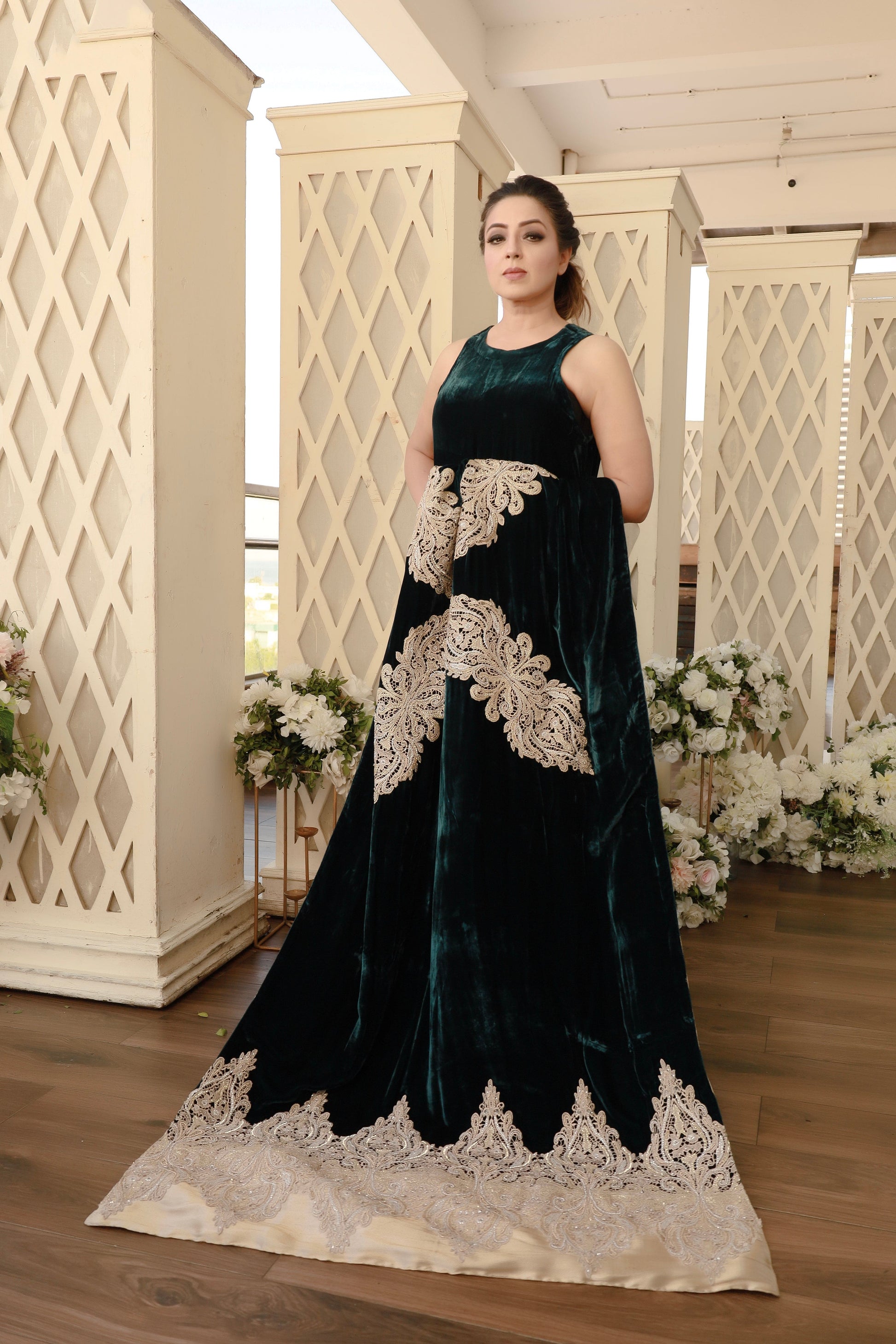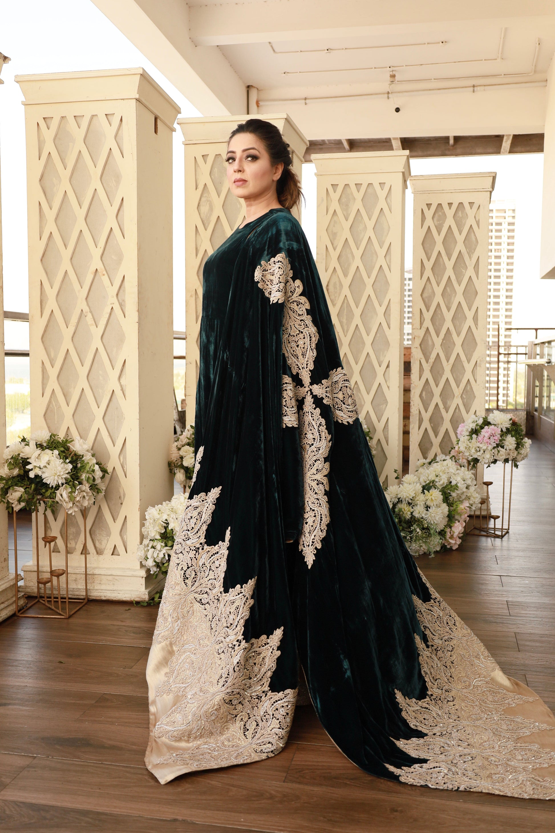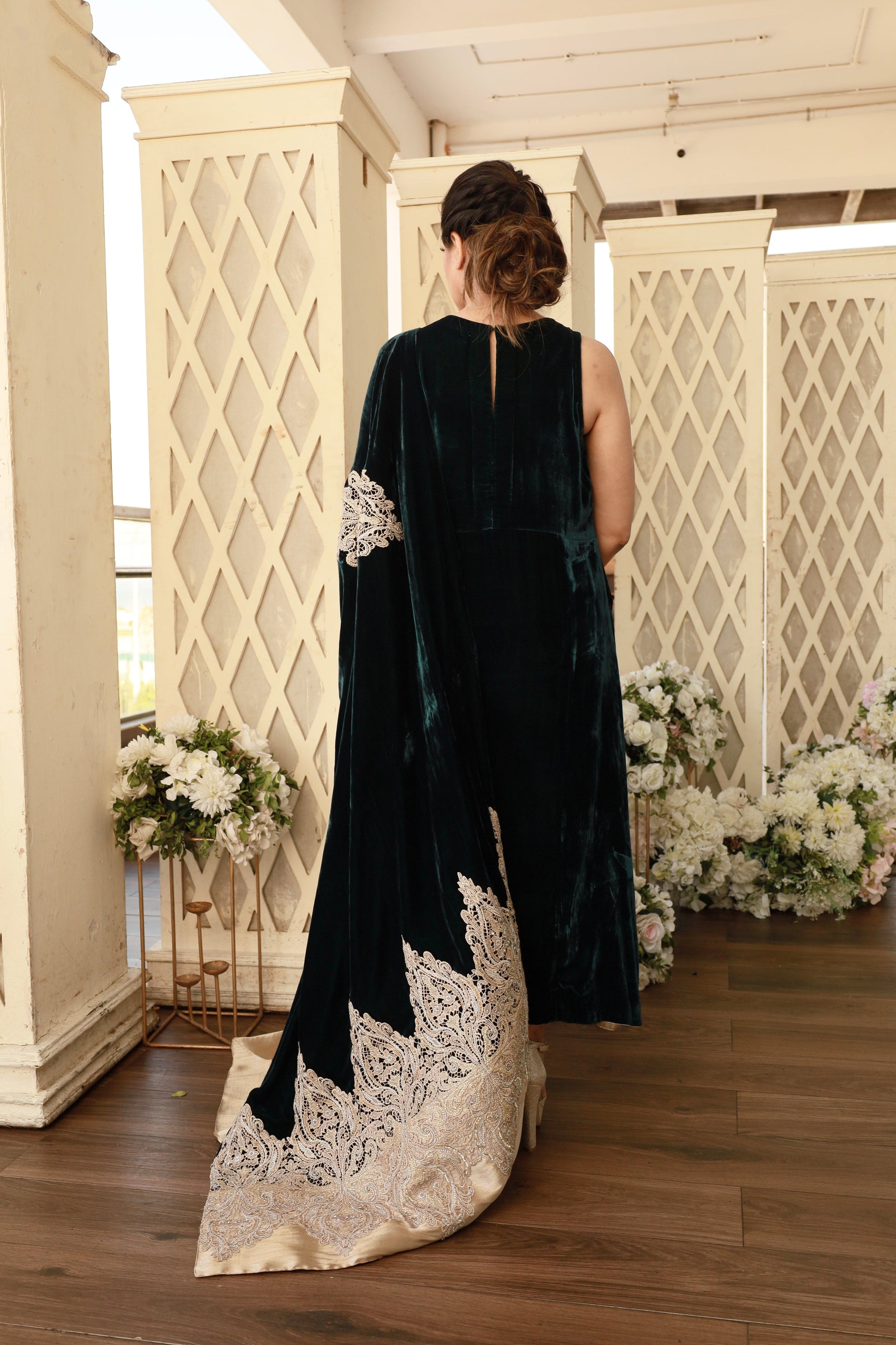 Elegant & sophisticated this ensemble in a deep shade of emerald green is cut from the softest velvet. Meticulously hand-crafted, the alluring velvet shawl has gold tissue pallus and is adorned with gold zardozi motifs. The silk pants with tilla and dabka embroidered birds complete the look. Pair yours with some fun earrings to steal the show with effortless style!
