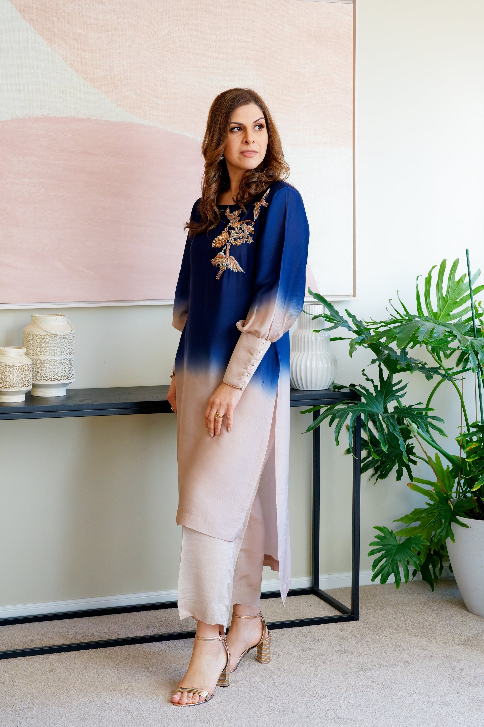 A nod to modern day glamour with this immaculately designed ensemble. Cut from plush silk, the impeccable tailoring and sleek lines of this ensemble will have you reaching for it whenever you really want to make an impact. The bird inspired motifs are intricately worked with resham, dabka and pearls and the high cuffed sleeves add to the allure of this outfit. Pair yours with silk pants and some fun earrings to steal the show with effortless style!