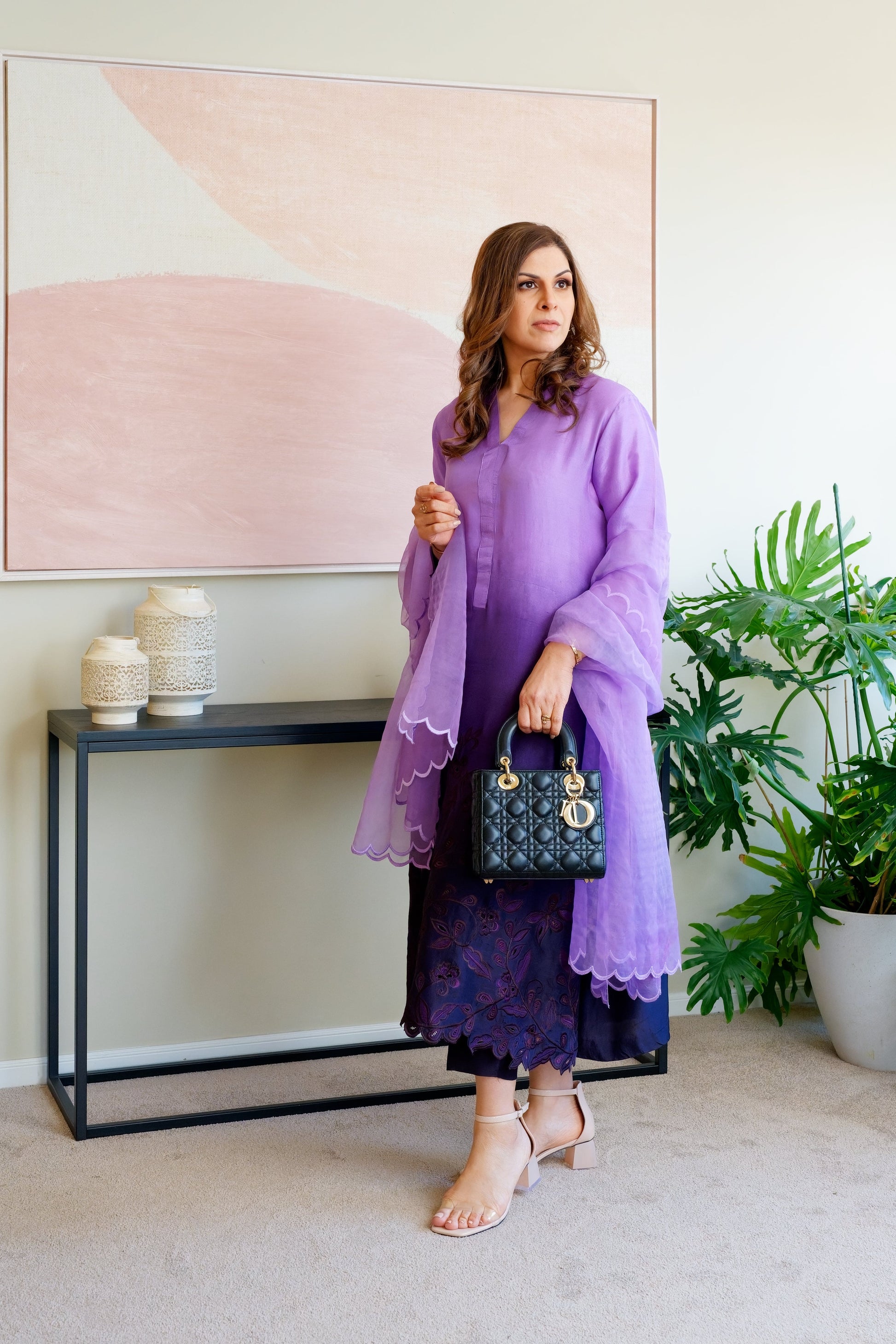 Craftsmanship par excellence, this sunset purple pure raw silk shirt features threaded flowers of resham and cutwork scattered over the hemline blossoming to the tunes of spring. Matching silk pants and organza dupatta complete the look.