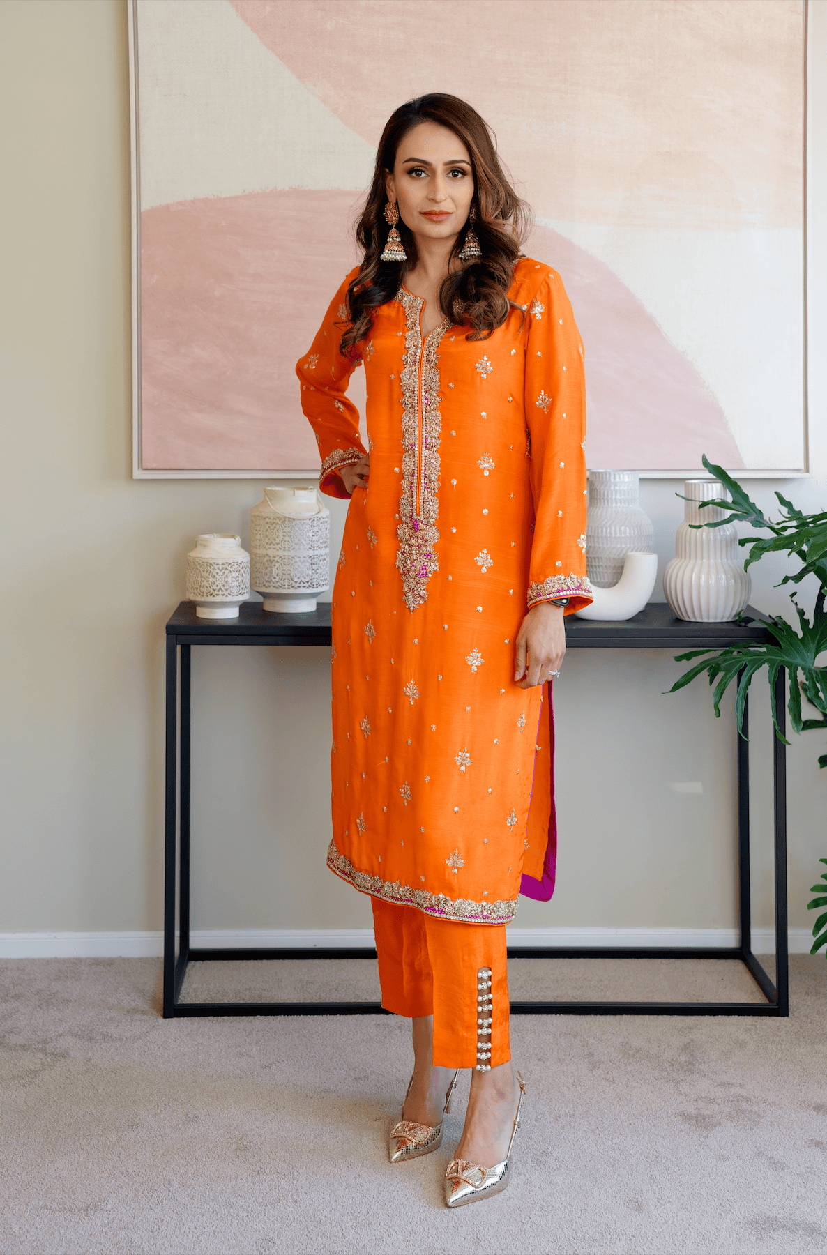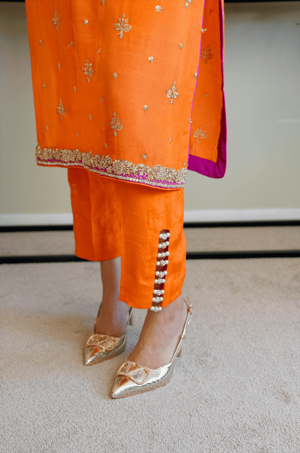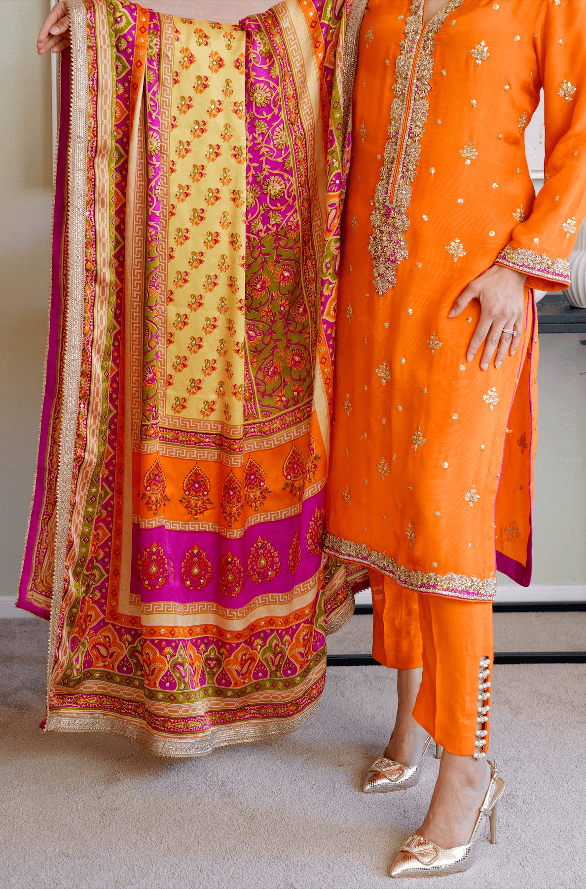 This head turning ensemble is an amalgamation of vibrant hues and a modern silhouette. Emblazoned with classic block print and hand-embellished with sitaras, the dupatta is a stunning display of mastery over colours in the shades of burnt orange, magenta pink & olive green. The shirt is intricately hand embroidered with dabka, zari, resham and tilla. It's a must have classic for every festive celebration, season after season.