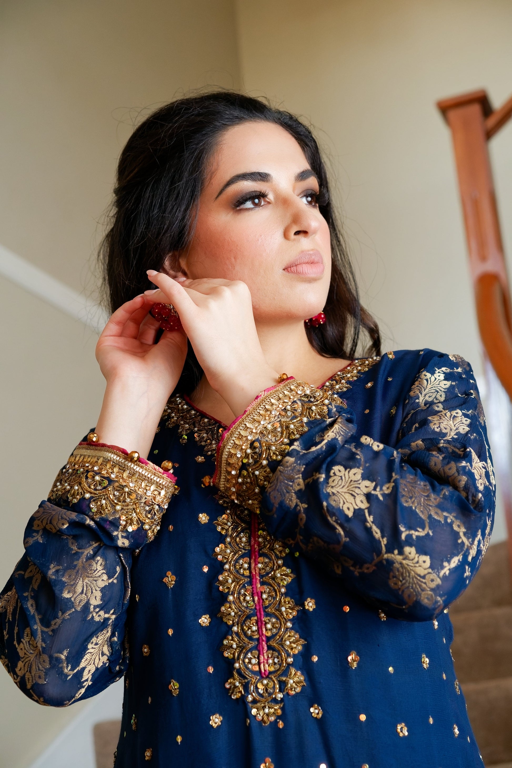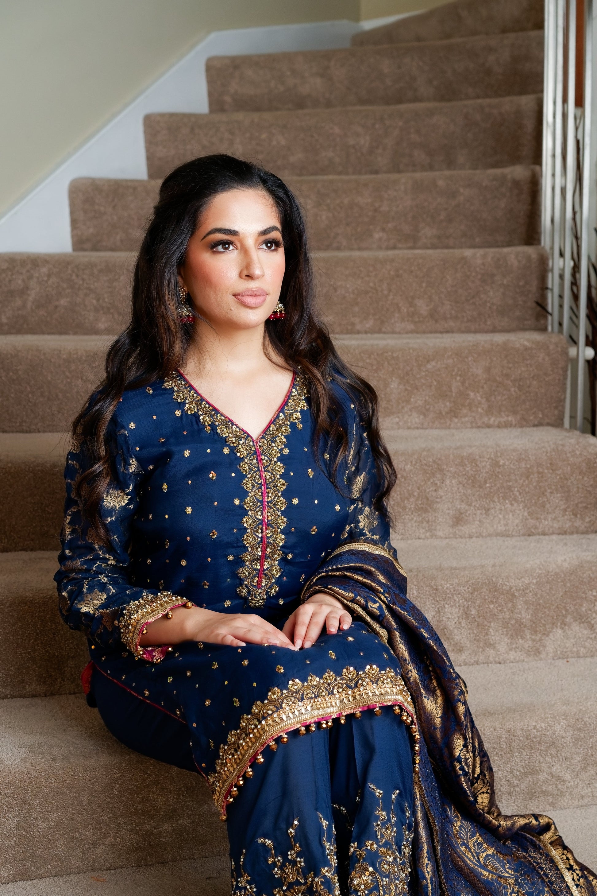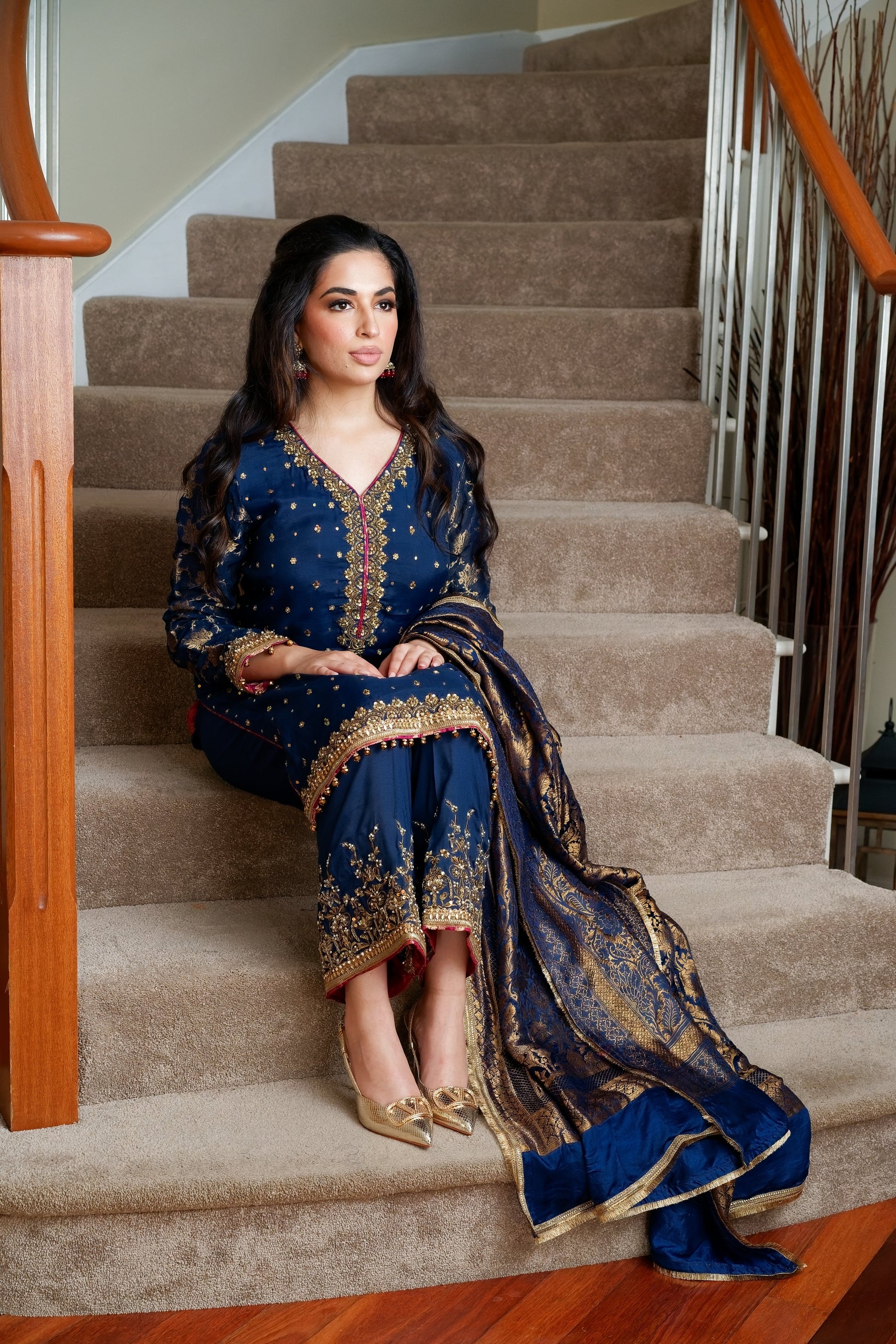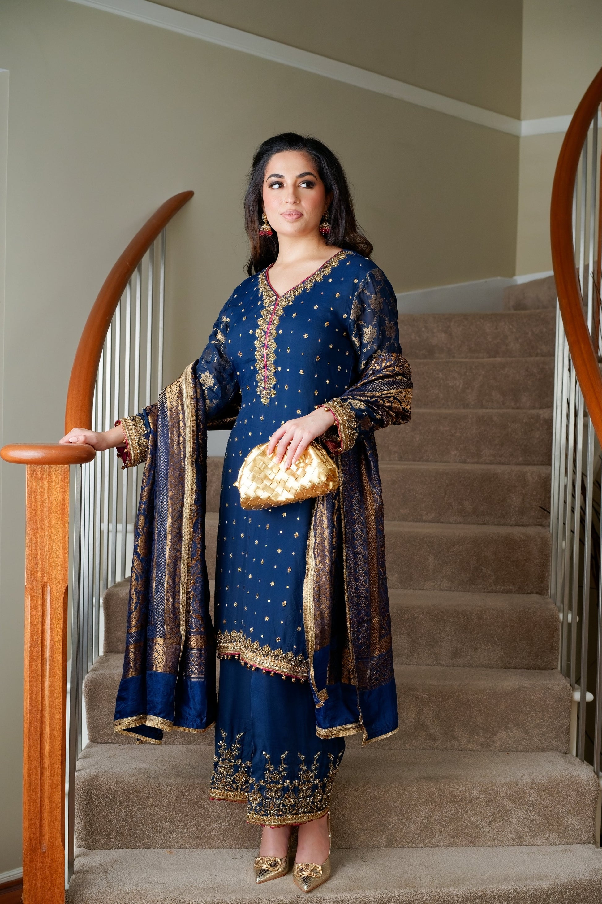 Crafted in the finest fabrics and adorned with traditional zardozi, dabka, and nakshi embellishments, this timeless midnight blue ensemble is truly captivating. The attention to detail in both fabric selection and craftsmanship makes it a standout choice for special occasions. The neckline and culottes are intricately hand-embroidered with traditional techniques, showcasing the artistry and skill involved in creating this masterpiece. The embellishments in zardozi, dabka, and nakshi add a touch of opulence and cultural richness to the ensemble. To enhance the overall elegance, the ensemble is paired with a chiffon banarsi dupatta, completing the look with grace and sophistication. This midnight blue silk ensemble is a testament to timeless style and traditional craftsmanship, making it a coveted choice for those who appreciate refined and exquisite fashion.