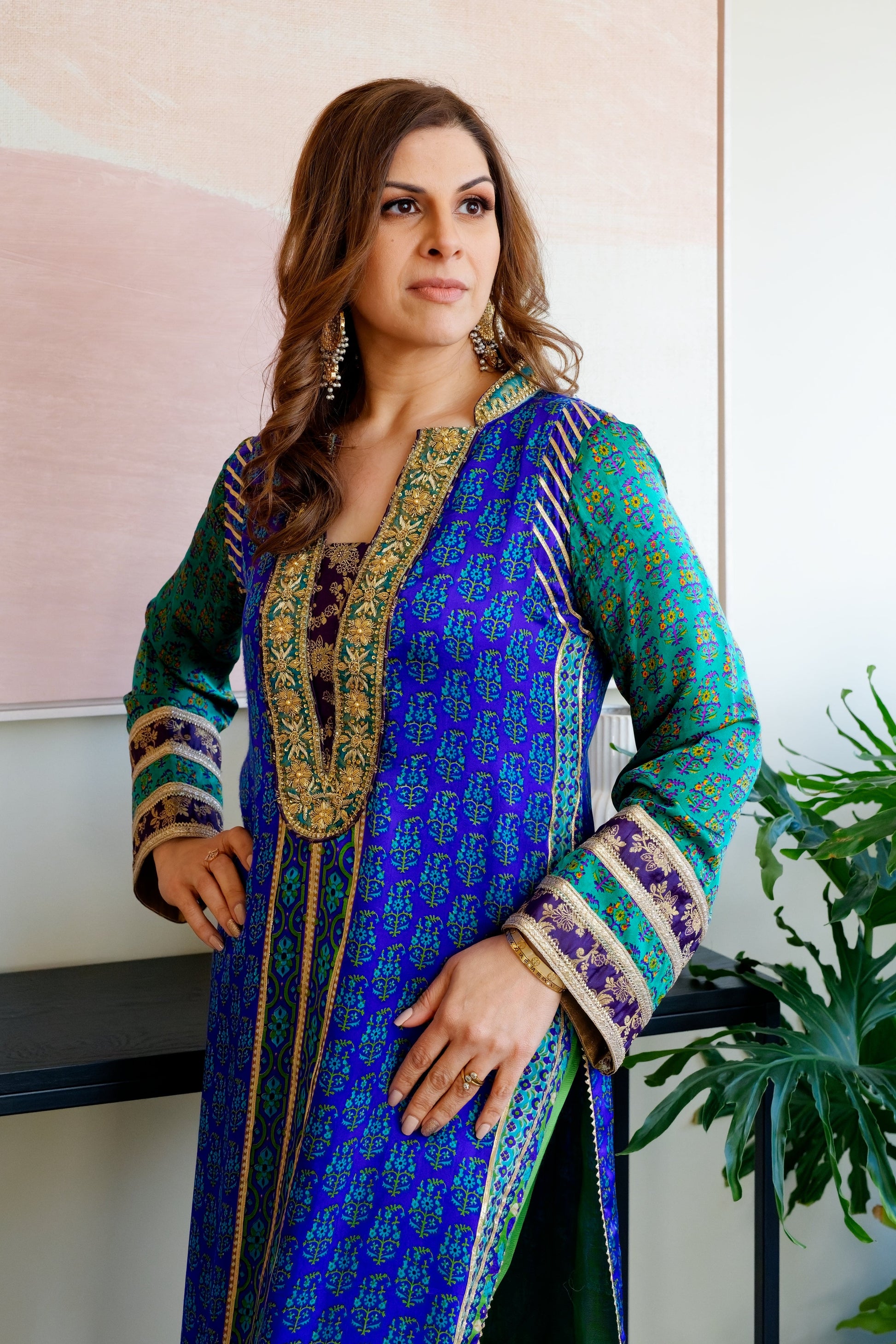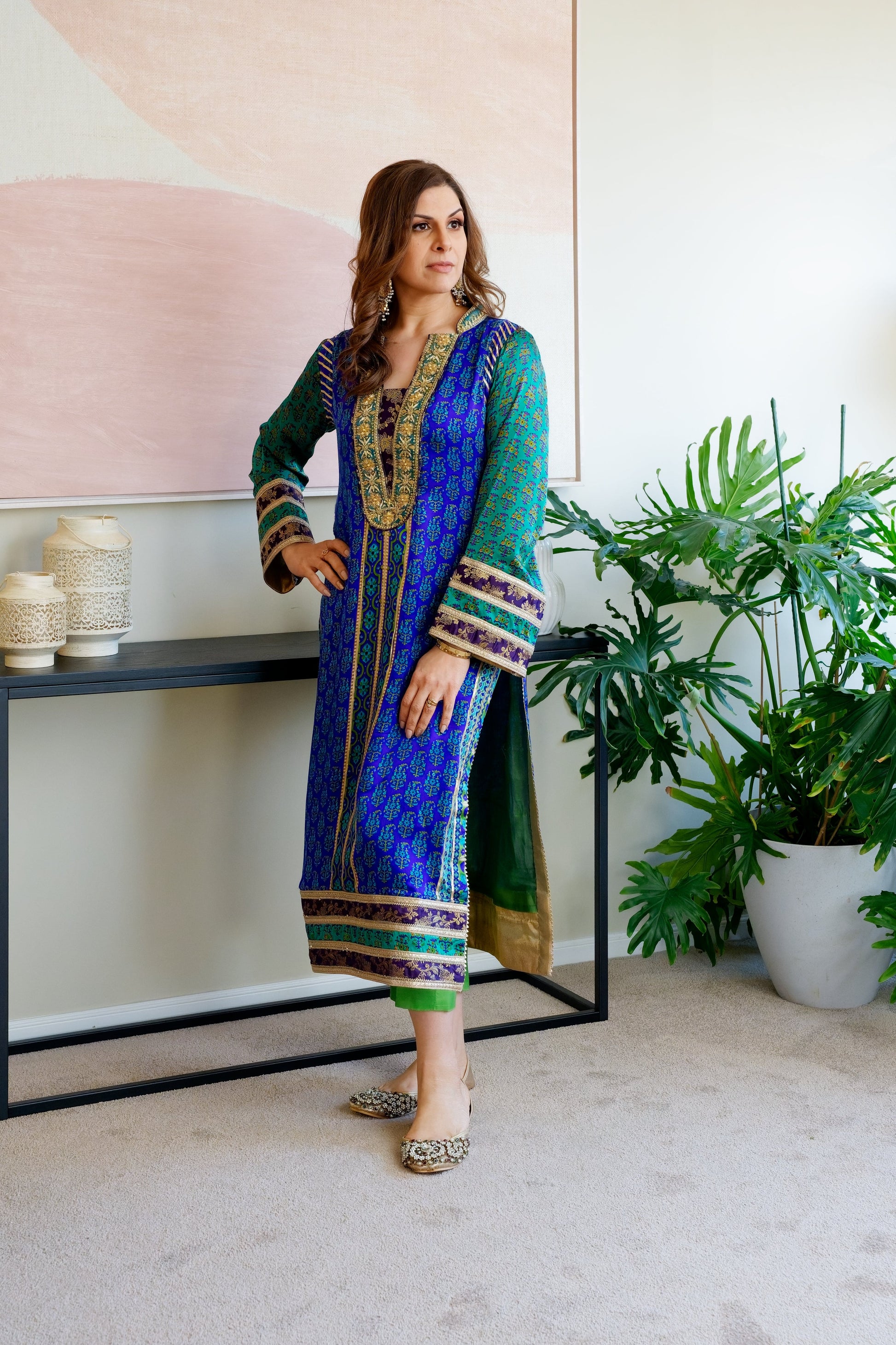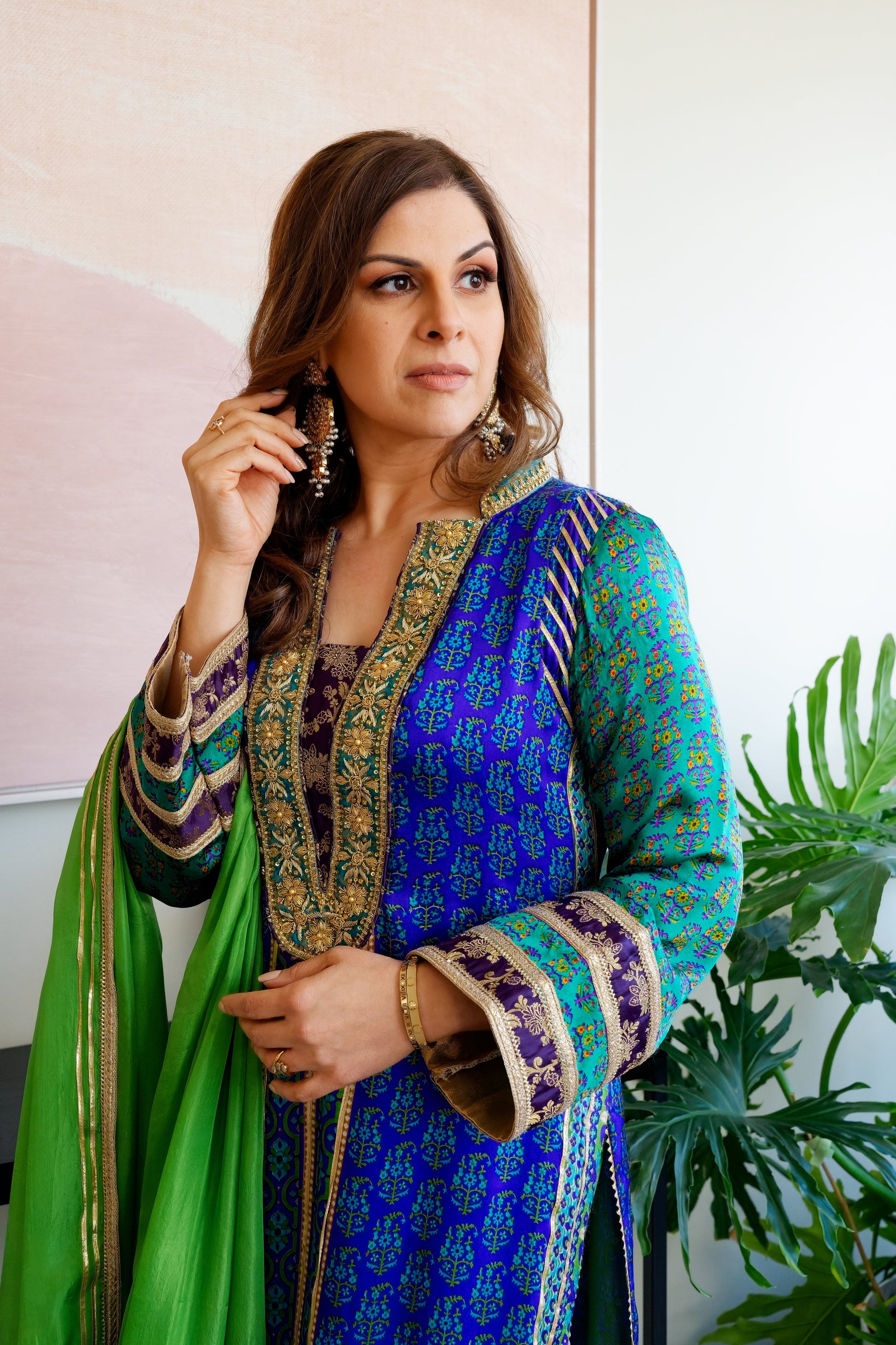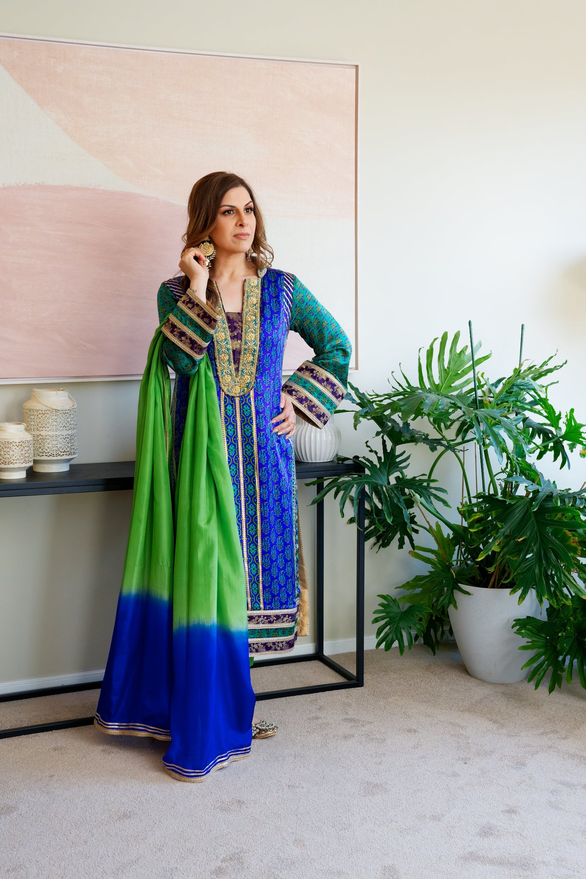 This head turning ensemble is an amalgamation of vibrant hues and a perfect addition to your wedding wear wardrobe. The gorgeous block print shirt has a hand embellished neckline with dabka, tilla, naqshi and resham. The 2-tone silk dupatta with gota detailing completes the look.