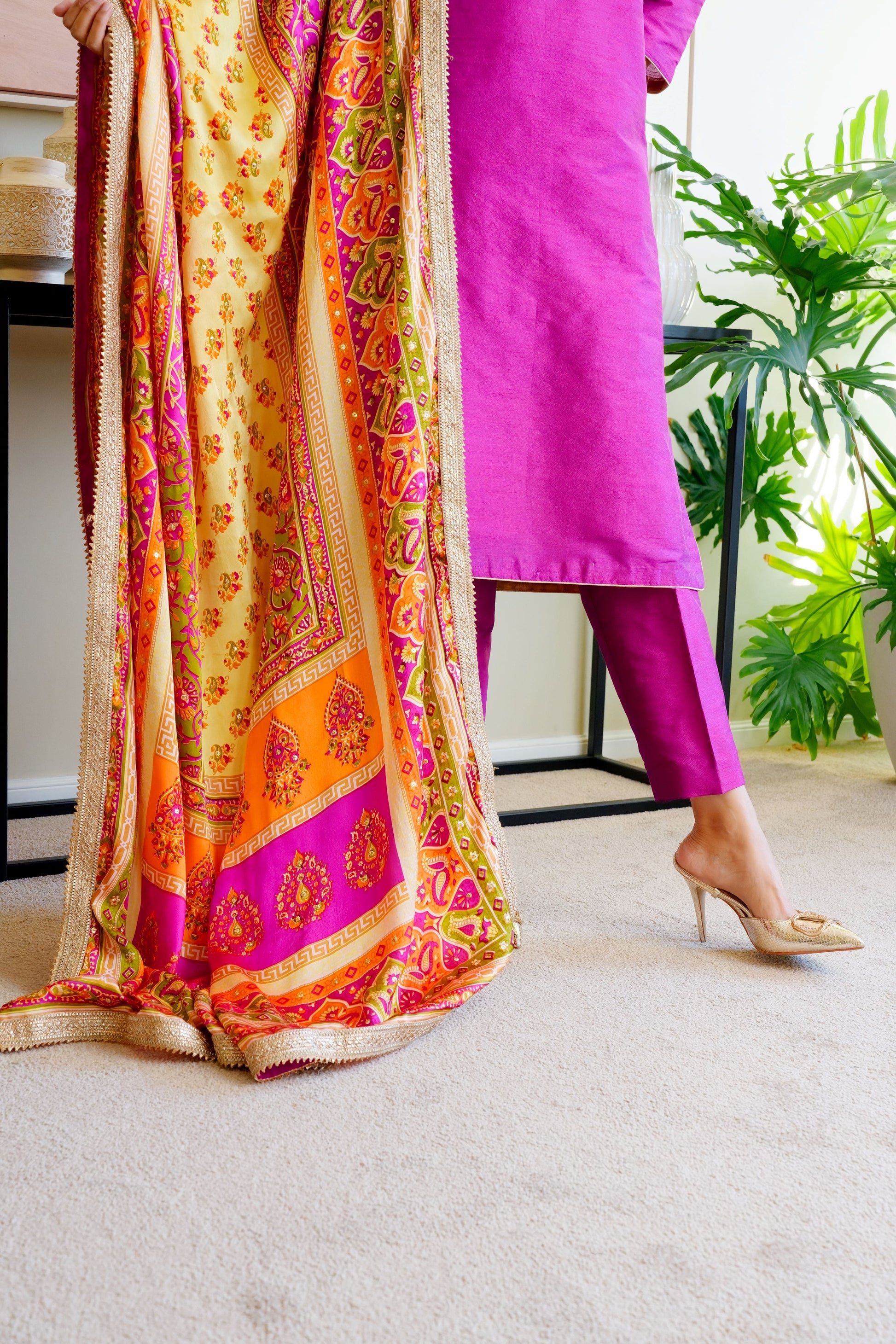 This head turning ensemble is an amalgamation of vibrant hues and a modern silhouette. Emblazoned with classic block print and hand-embellished with sitaras, the stunning dupatta is a stunning display of mastery over colours in the shades of burnt orange, magenta pink & olive green. It’s a must have classic for every festive celebration season after season.