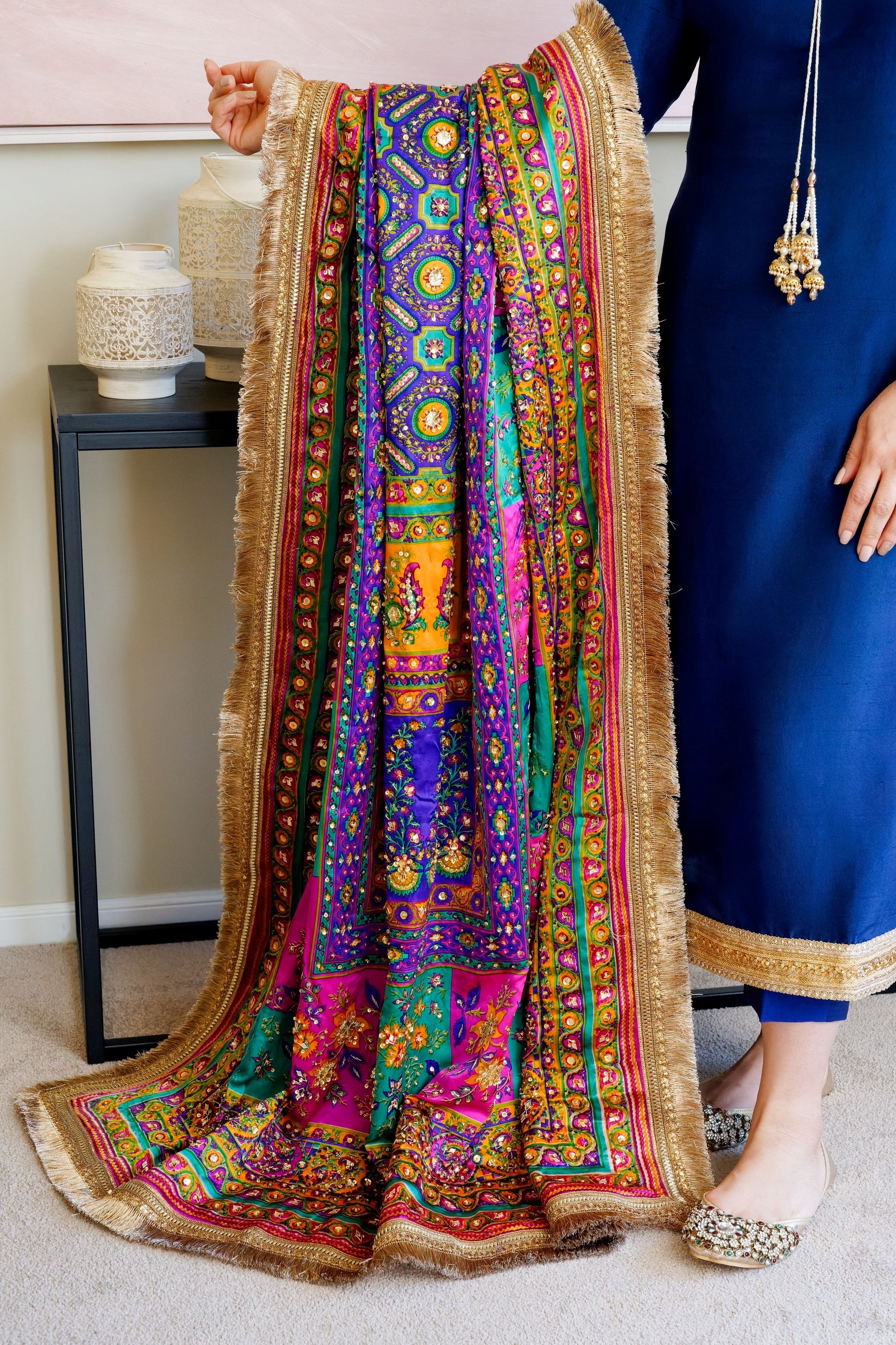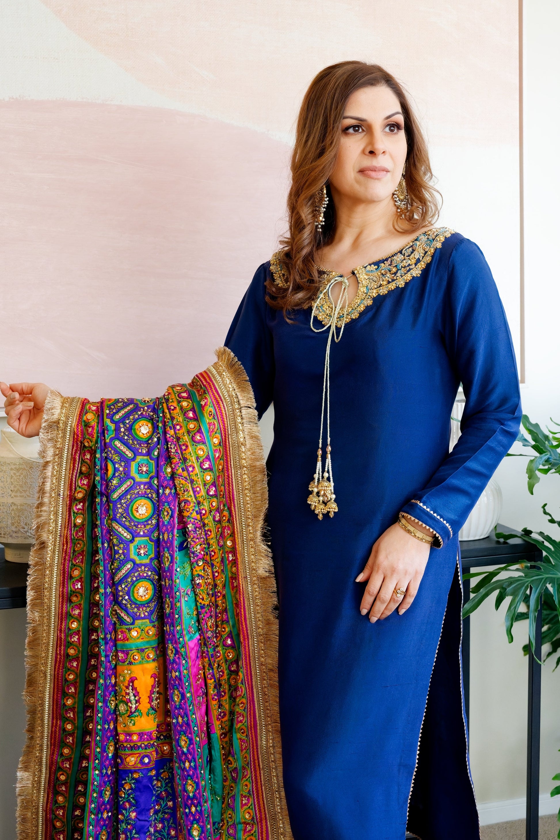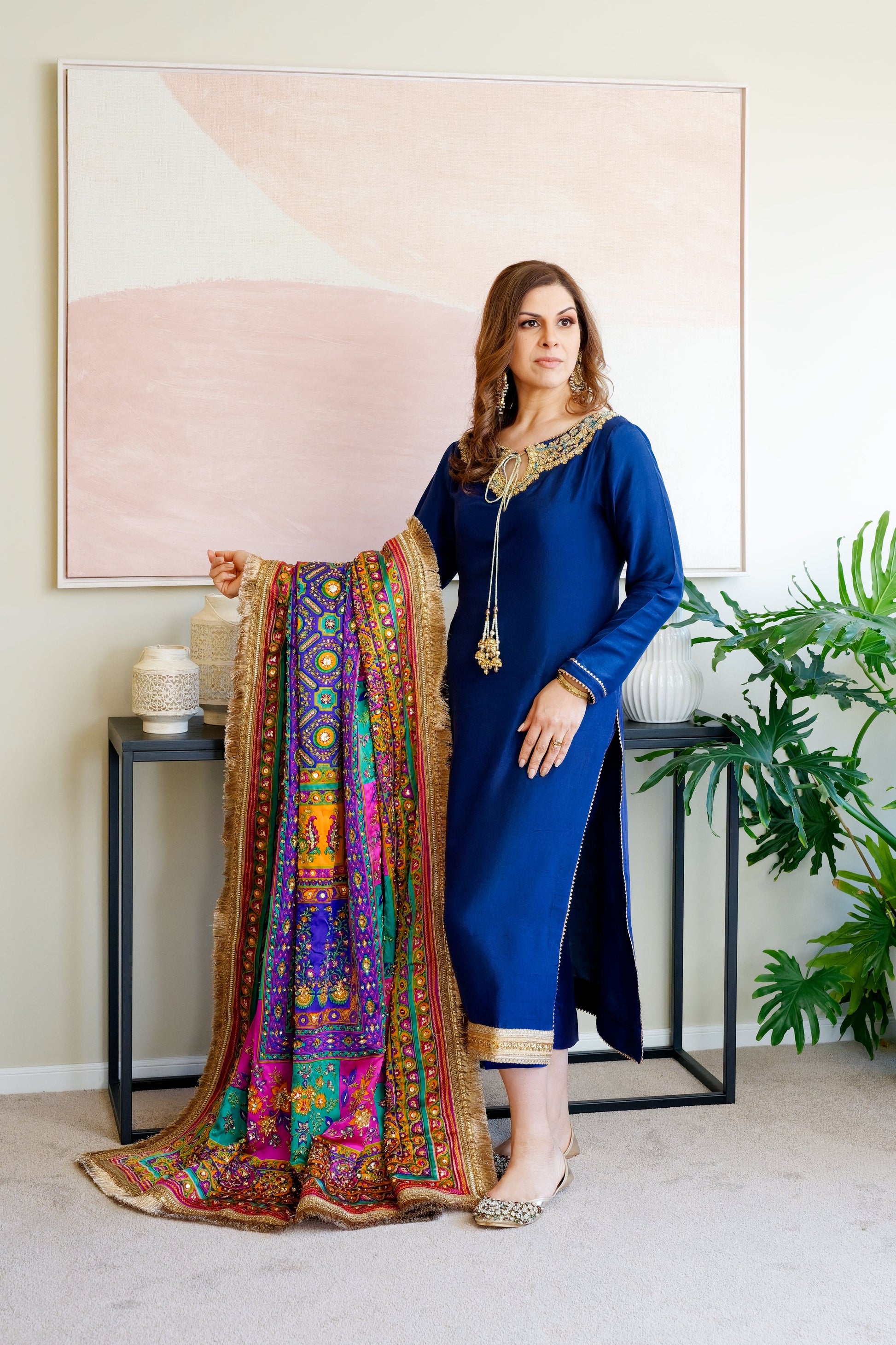 This head-turning ensemble is a captivating amalgamation of vibrant hues and a modern silhouette. Emblazoned with classic block print and hand-embellished with sitaras, the stunning silk dupatta is a mastery of colors in shades of magenta pink, sea green, and blue. The shirt features a traditional Hyderabadi neckline and is intricately hand-embroidered with dabka, zari, resham, and tilla. This attention to detail adds a touch of opulence and cultural richness to the ensemble. A must-have classic for every festive celebration, season after season, this silk ensemble combines traditional elements with contemporary design. The vibrant colors, exquisite embellishments, and modern silhouette make it a versatile and timeless choice for those who appreciate the artistry of fashion.