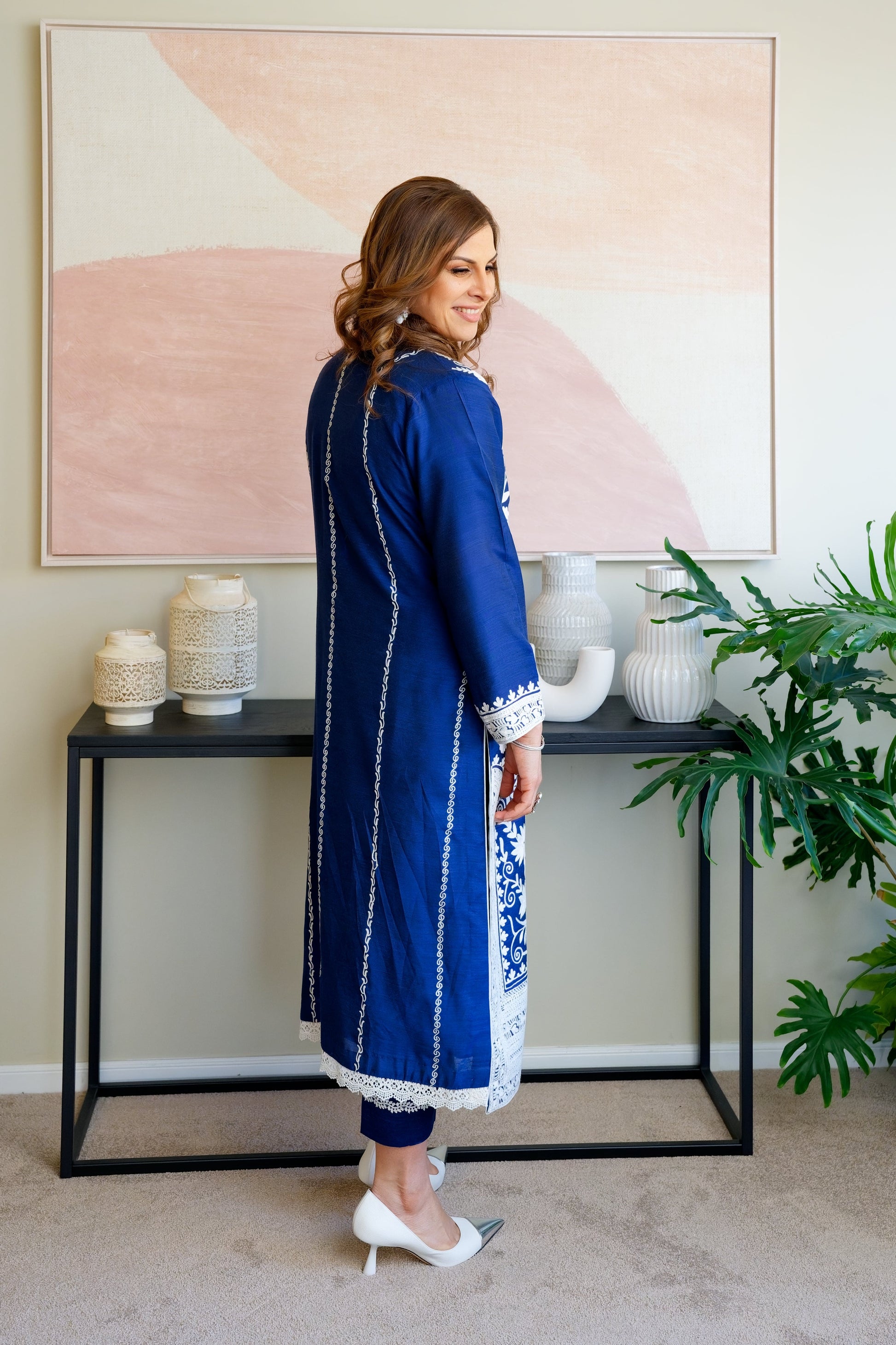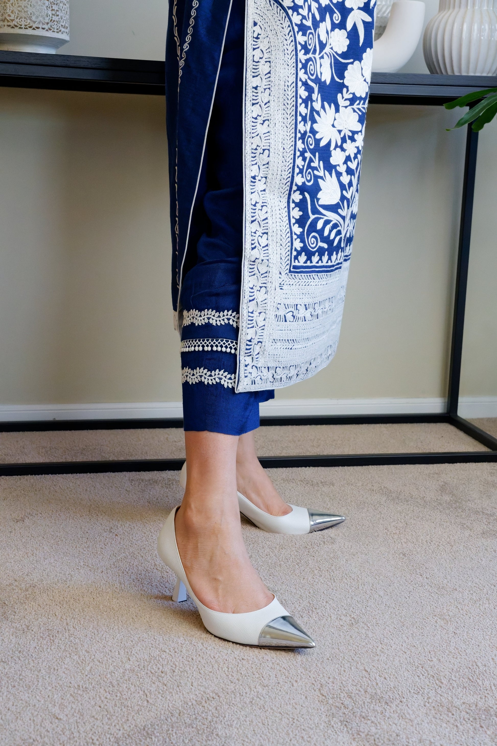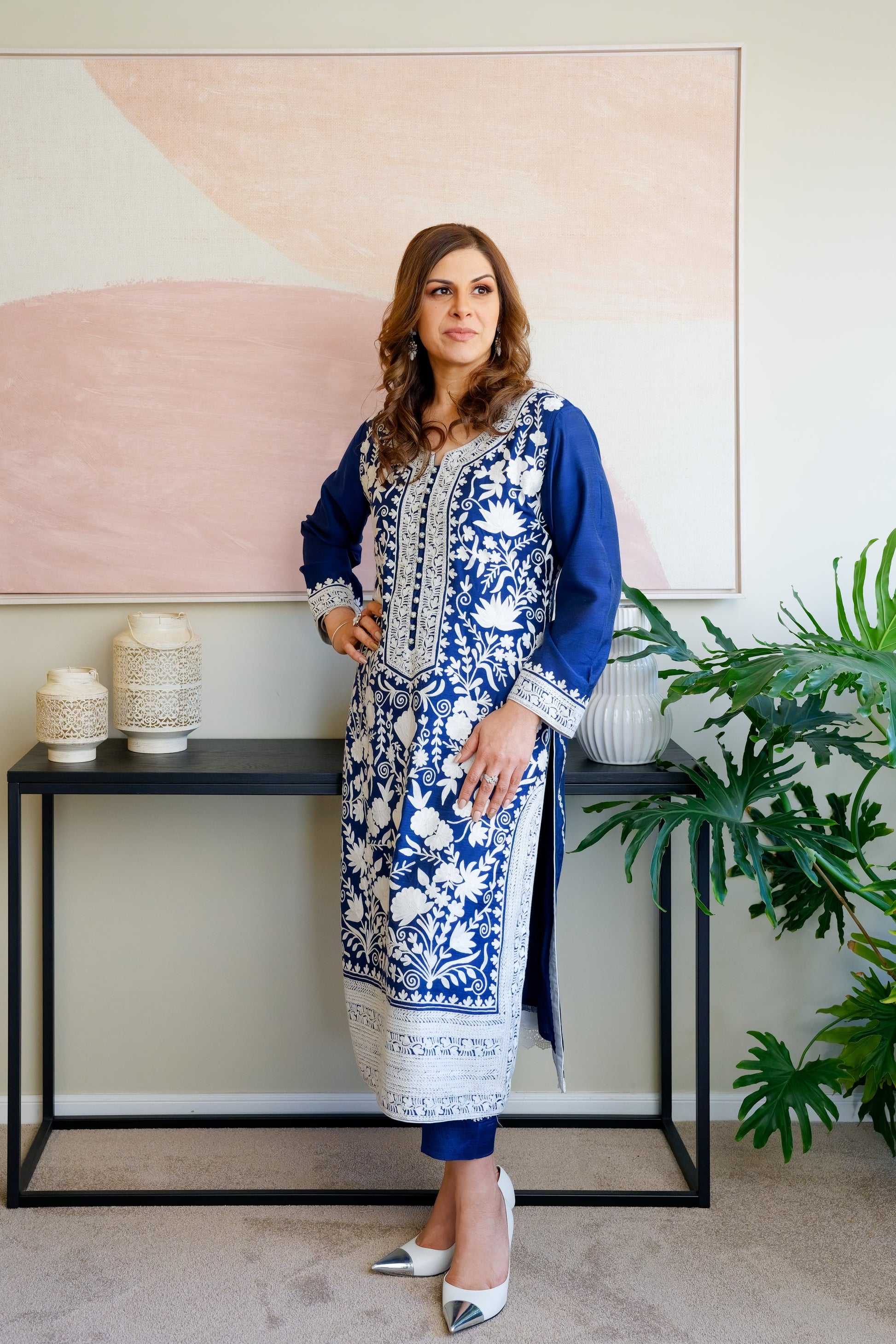 Step out in effortless style in this gorgeous ensemble. The cotton net shirt is heavily adorned with classic AAR embroidery in white resham. Pair yours with matching pants and some fun earrings to steal the show!