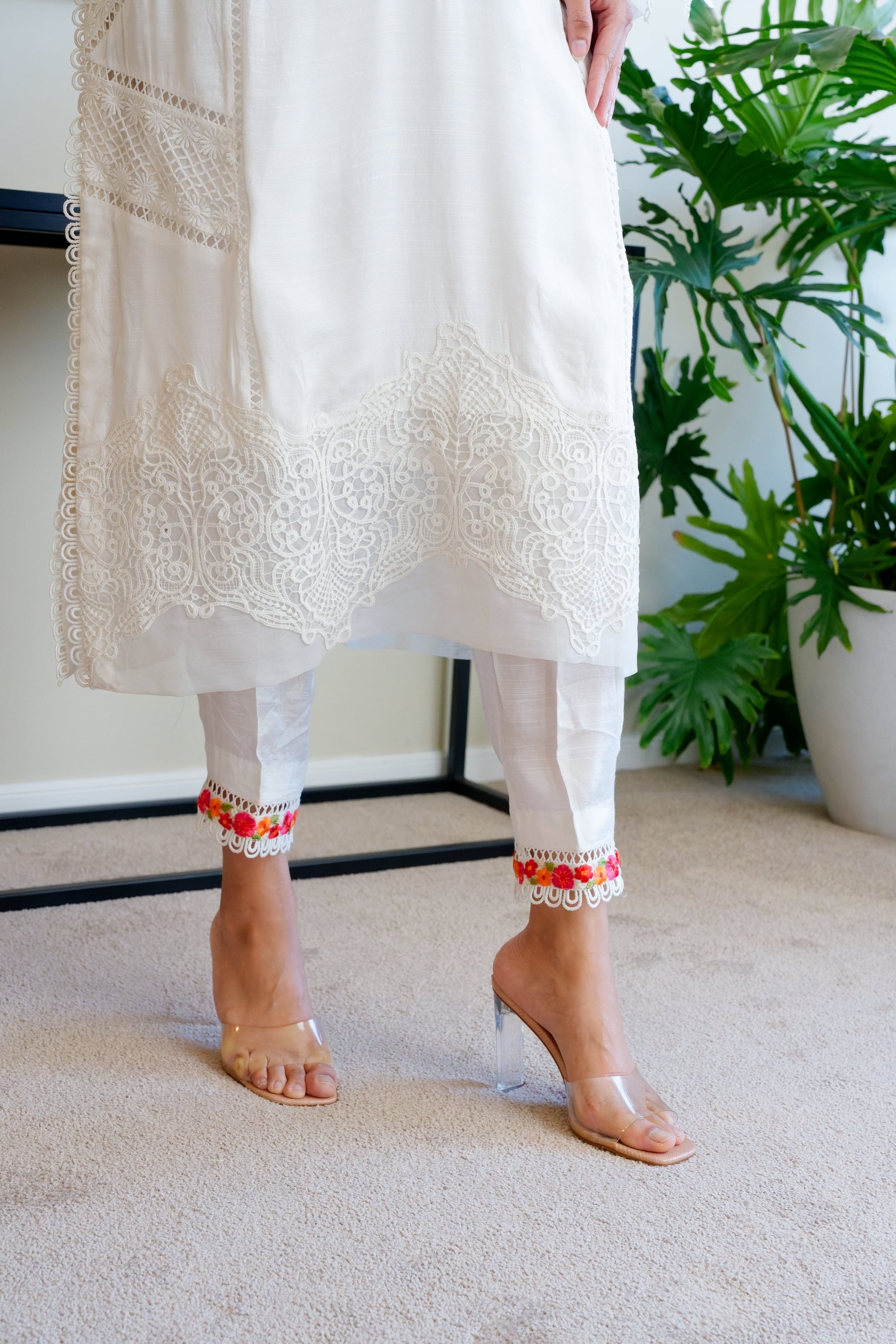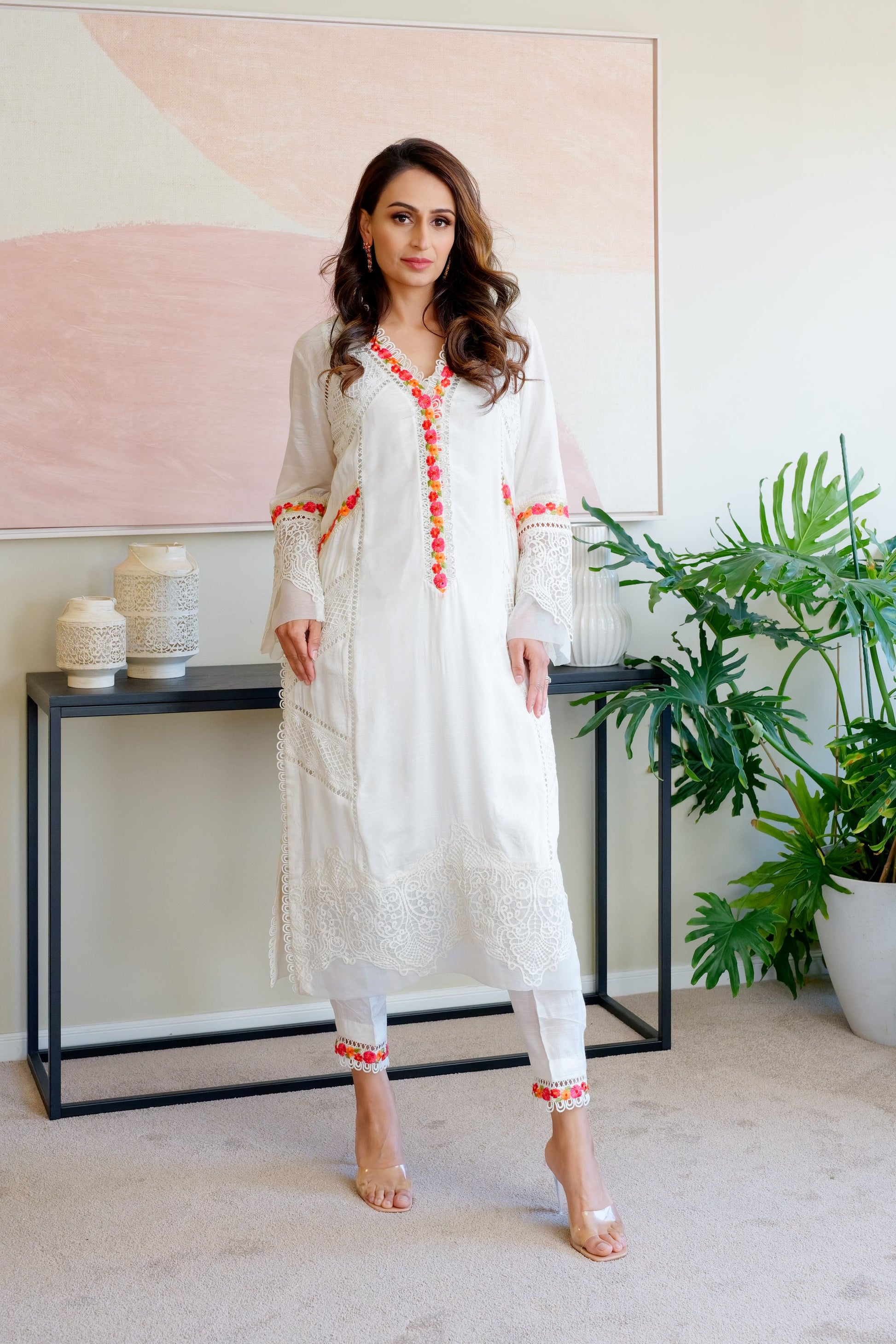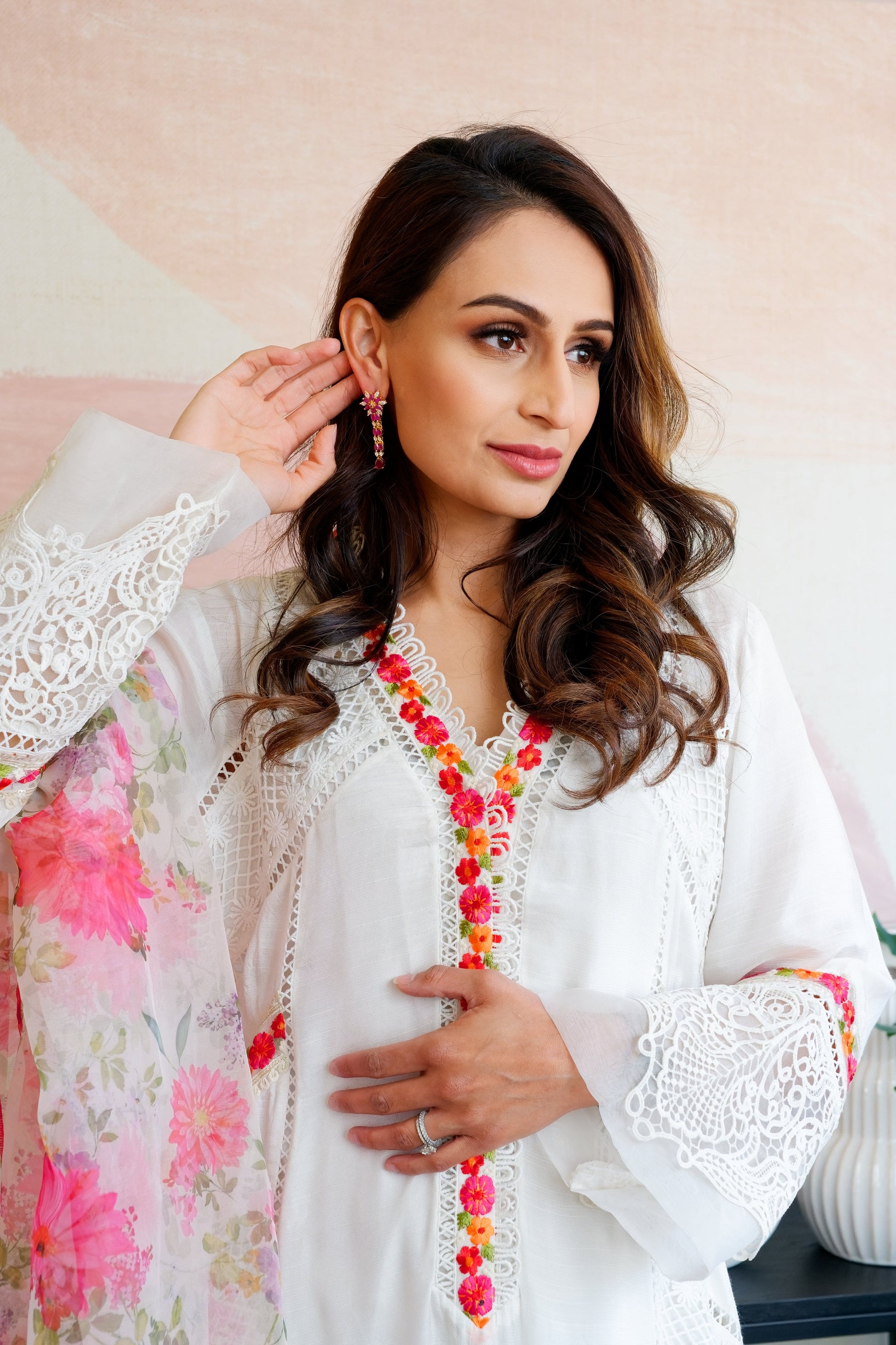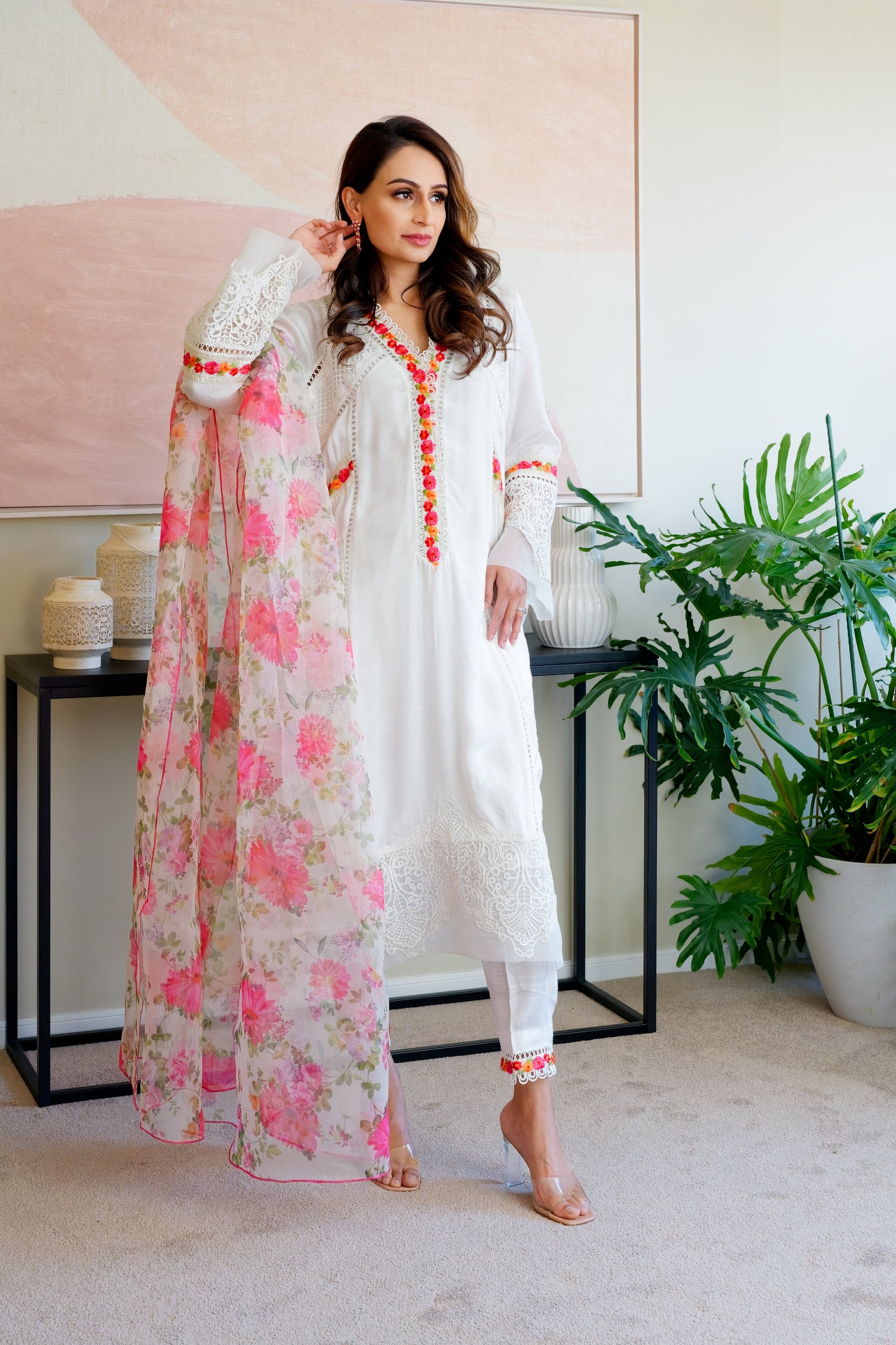 Irresistibly romantic florals, luxe fabrics and captivating details for the ultimate wardrobe refresh. The relaxed, much-loved silhouette has a universally flattering neckline, and is further enhanced with delicate floral embroidery. The sleeves and hem feature organza borders and lace detailing. A floaty and floral graceful organza dupatta, completes the look. Pair your outfit with our matching silk pants with lace detailing (as shown) and minimal earrings for a stunning look, no matter the occasion.