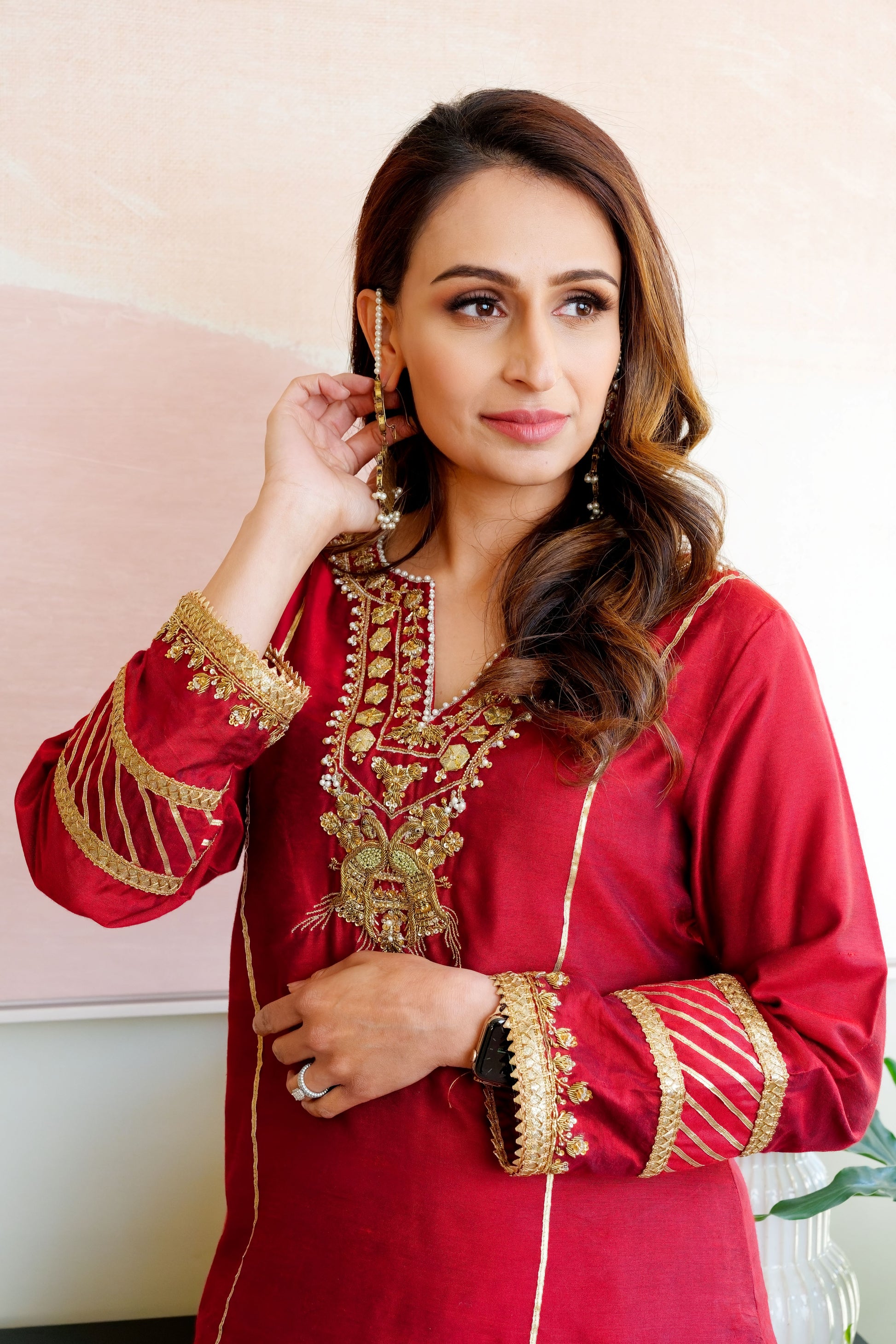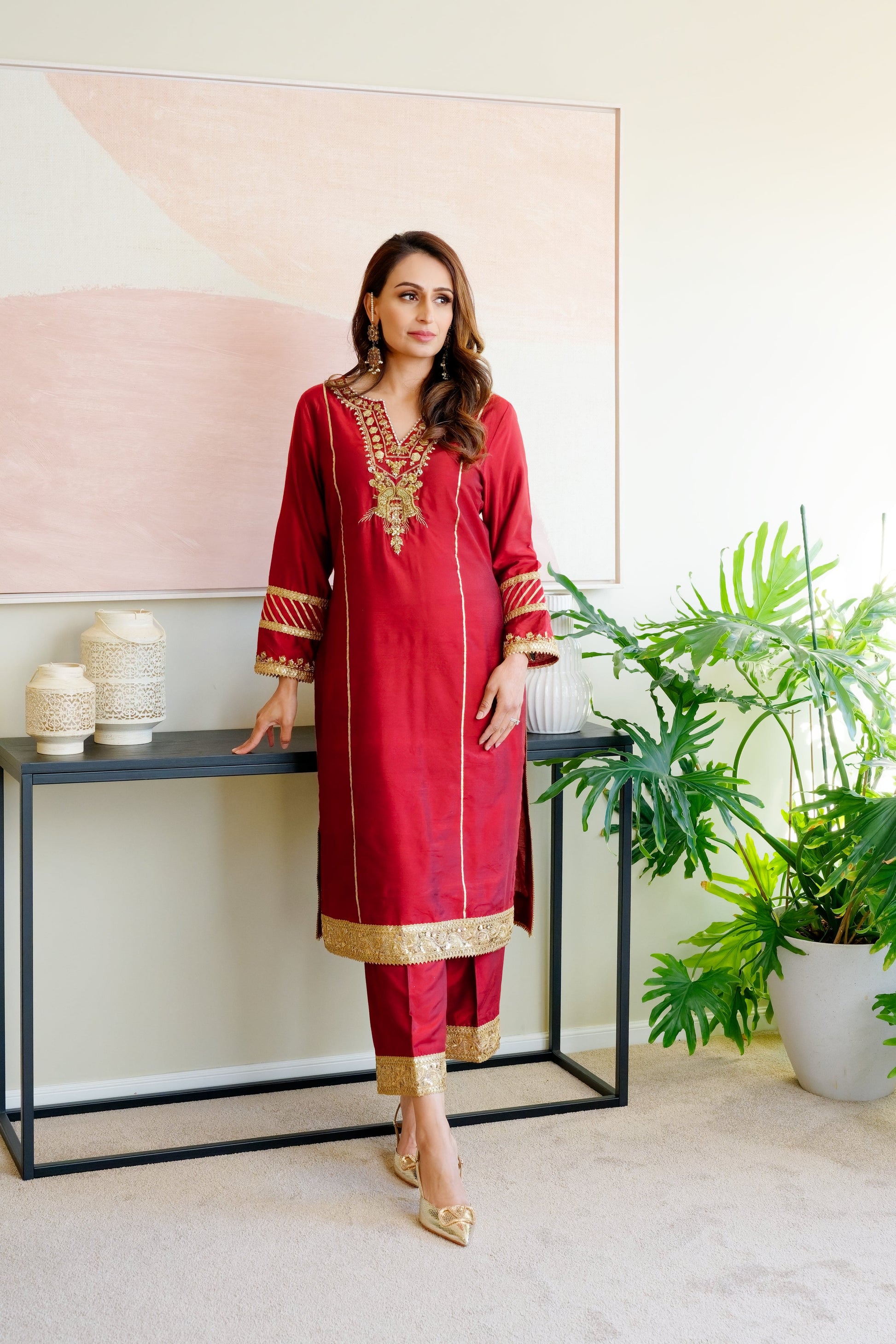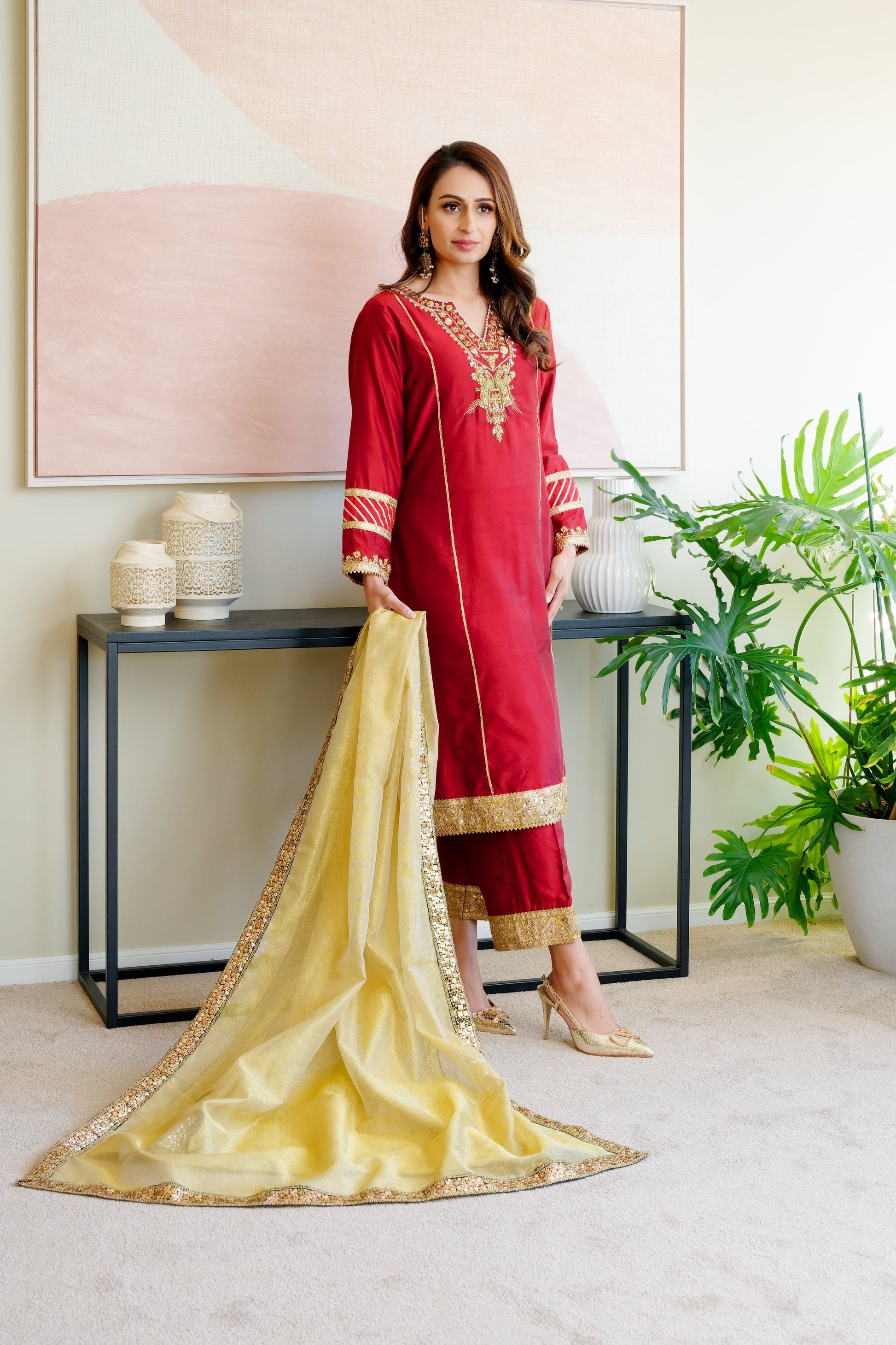 Cut from the finest fabric, the shirt has an intricately hand embroidered neckline with tilla, dabka and sequins and the daman is finished with gold detailing. Style yours with our matching culottes embellished with a gold border and gold net maysoree dupatta with sequins detailing to complete the look.