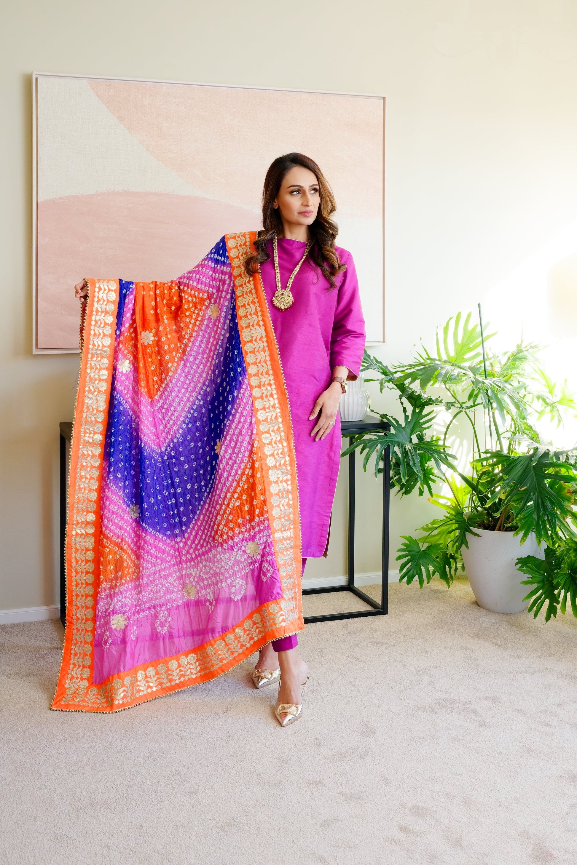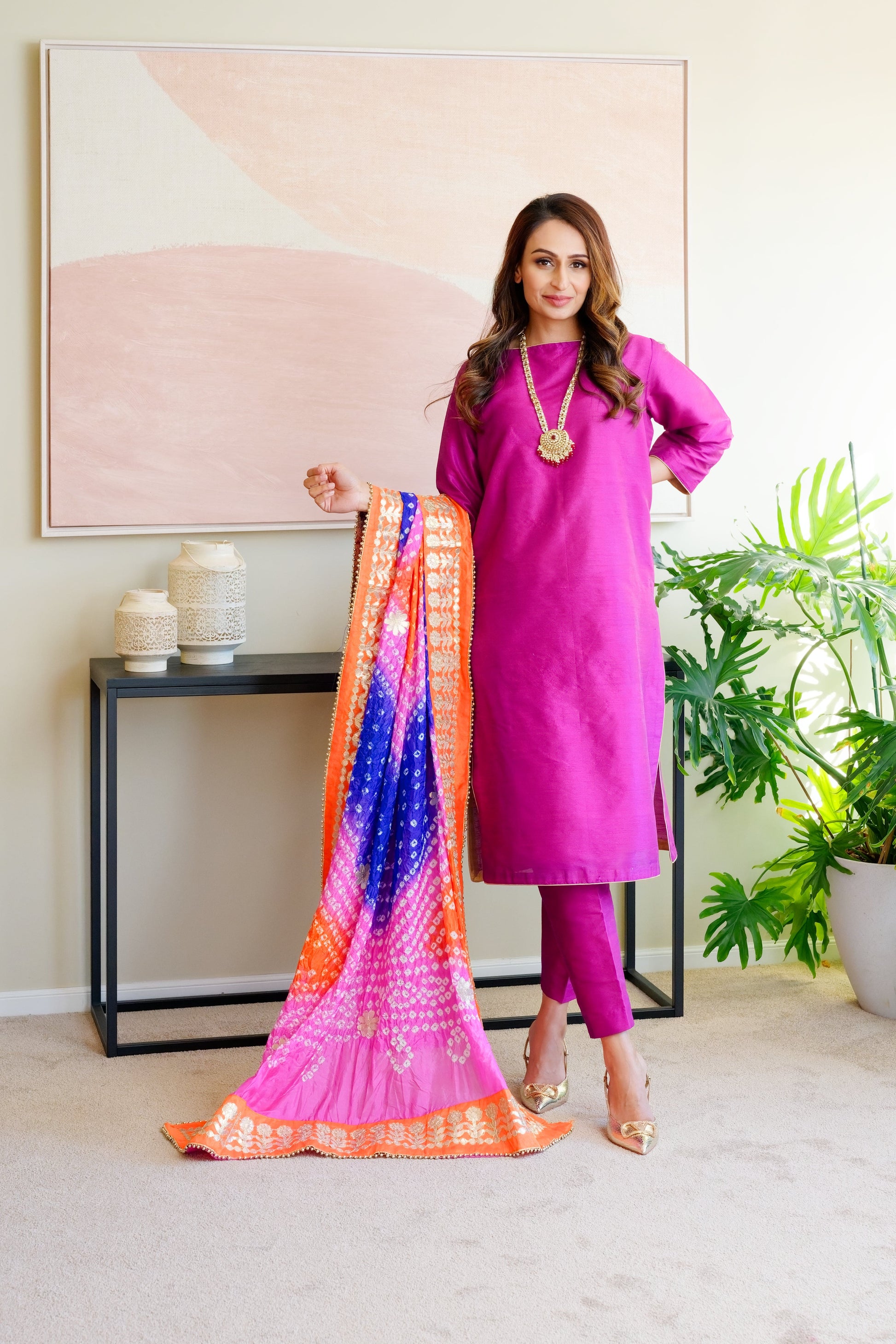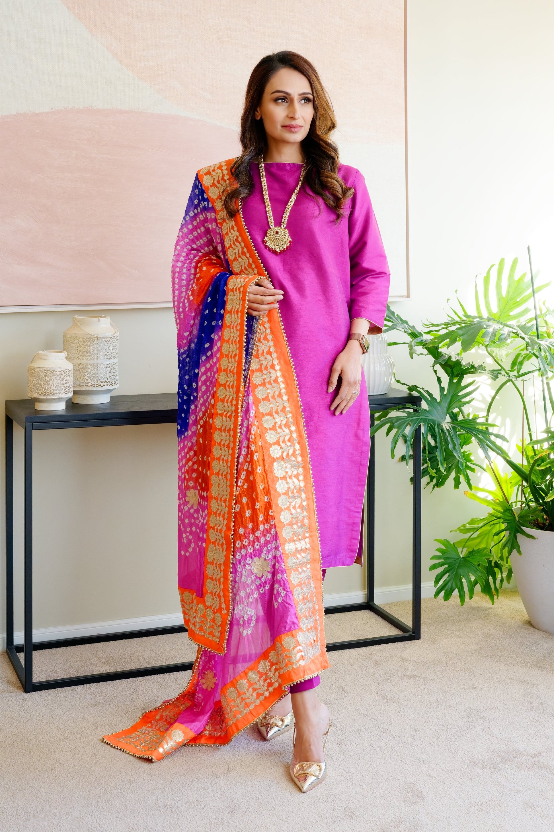 Be the epitome of glamour in this stunning ensemble. The relaxed, much-loved silhouette has a universally flattering neckline finished with gold detailing. Complete the look with a classic chunri dupatta in vibrant colours.