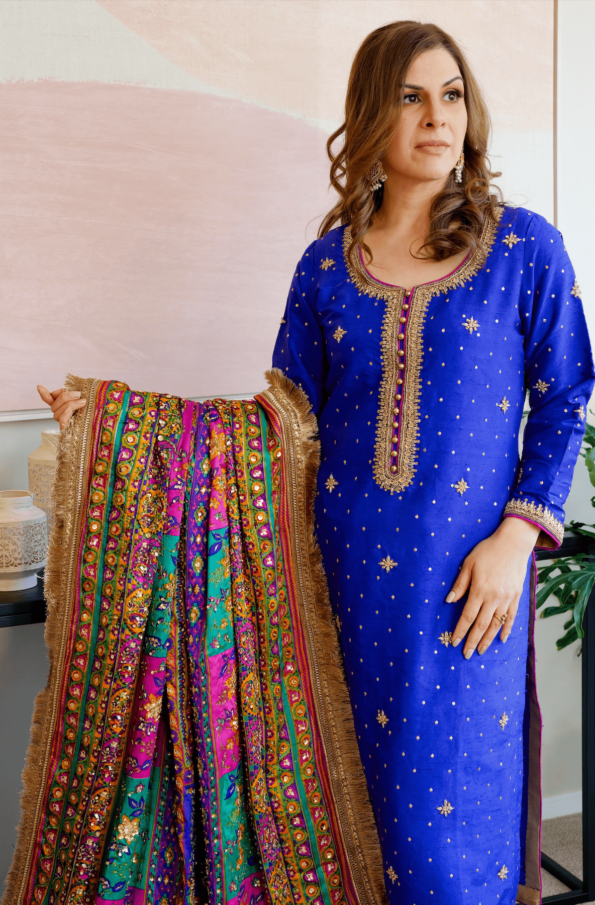 This head turning ensemble is an amalgamation of vibrant hues and a modern silhouette. Emblazoned with classic block print and hand embroidered with naqshi, tilla, zardozi and dabka, the stunning doshala is a stunning display of mastery over colours in the shades of burnt orange, magenta pink, purple & green. The shirt is also intricately embellished with dabka, zari, pearls and tilla. It’s a must have classic for every festive celebration season after season.