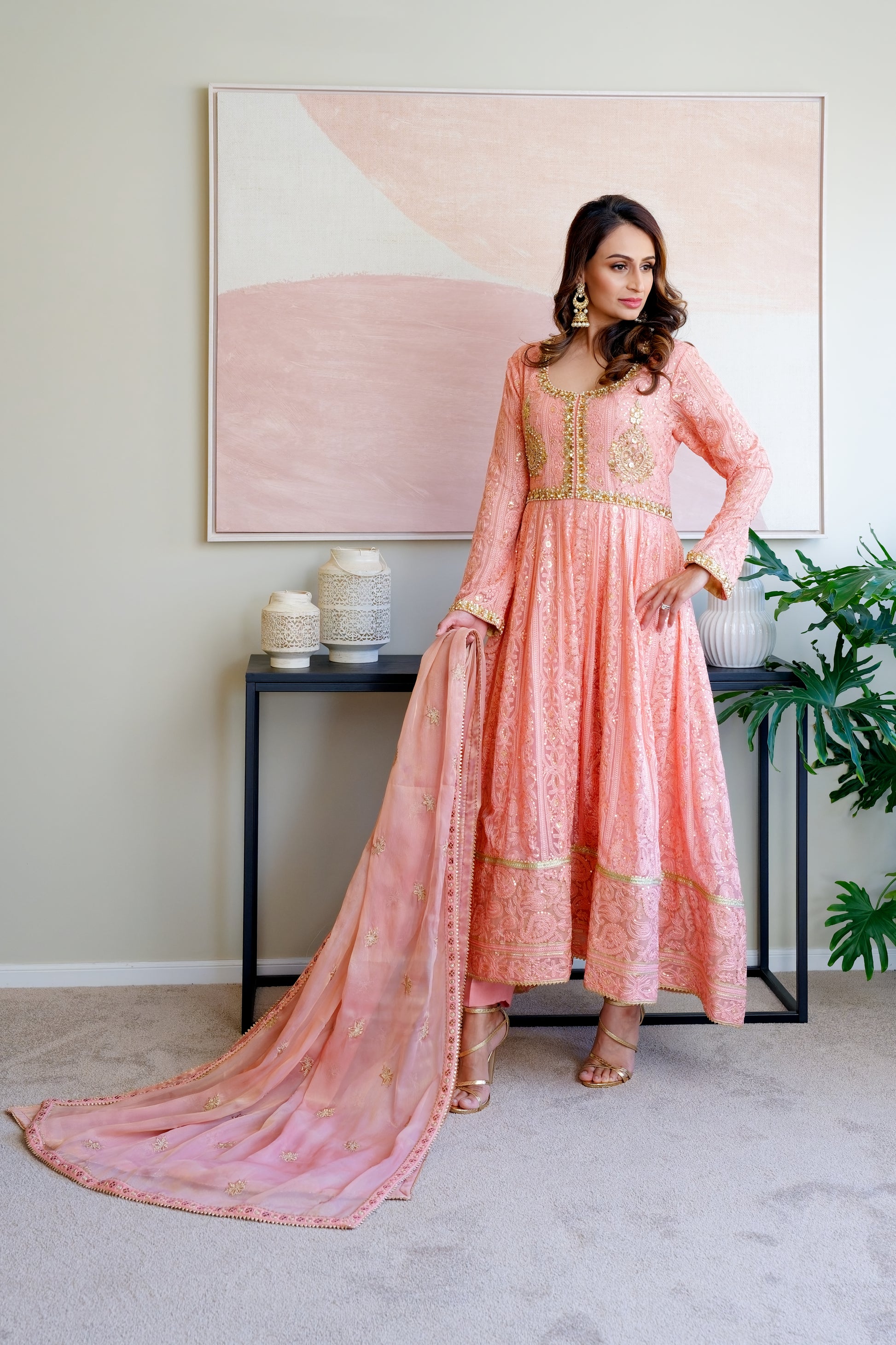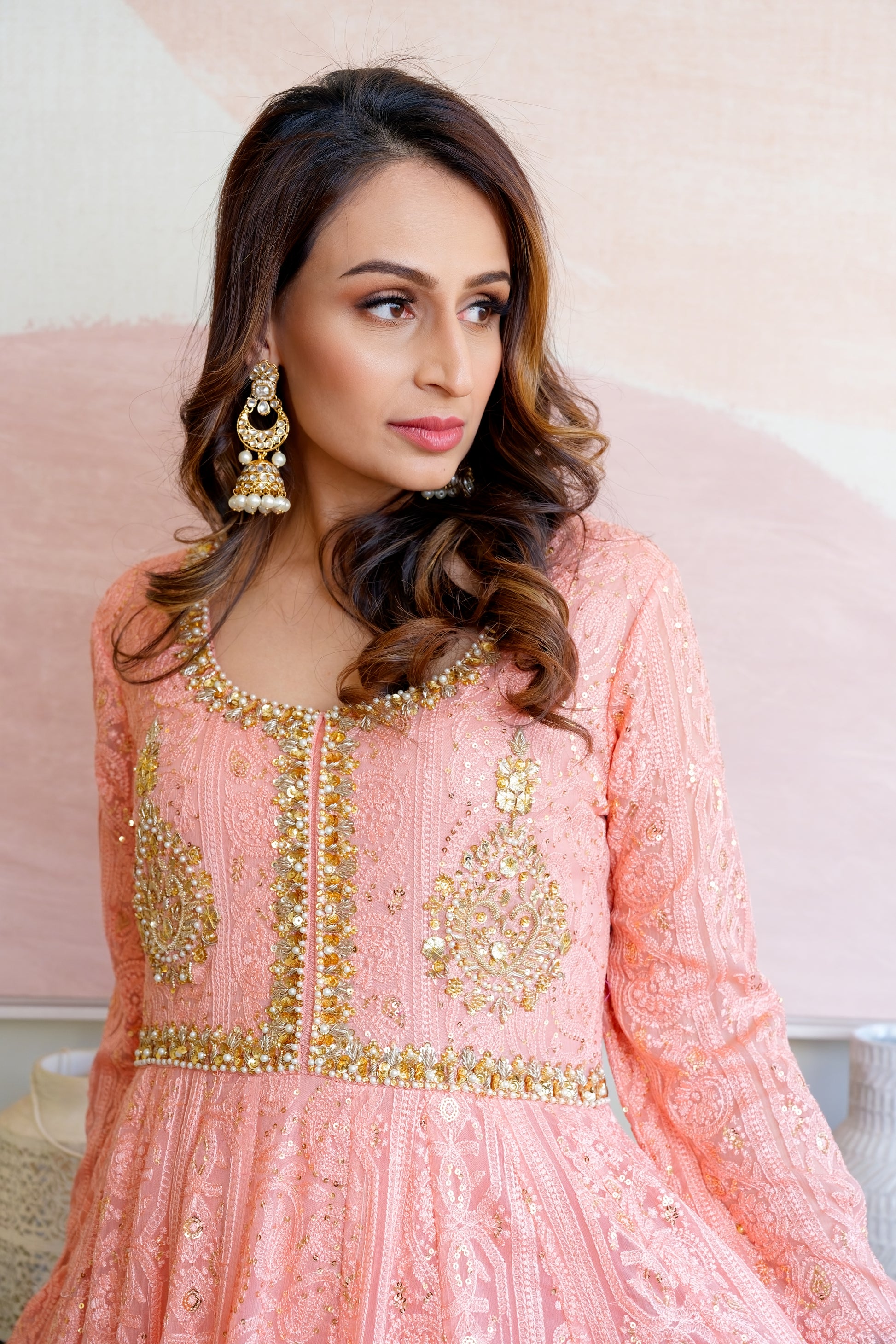 A heavily embellished chikankari peshwas with intricate zardozi, dabka and tilla work on the bodice is the perfect addition to your wedding-wear wardrobe. Paired with silk trousers and a maysoree dupatta accentuated with botis in tilla thread and lace detailing completes the look.