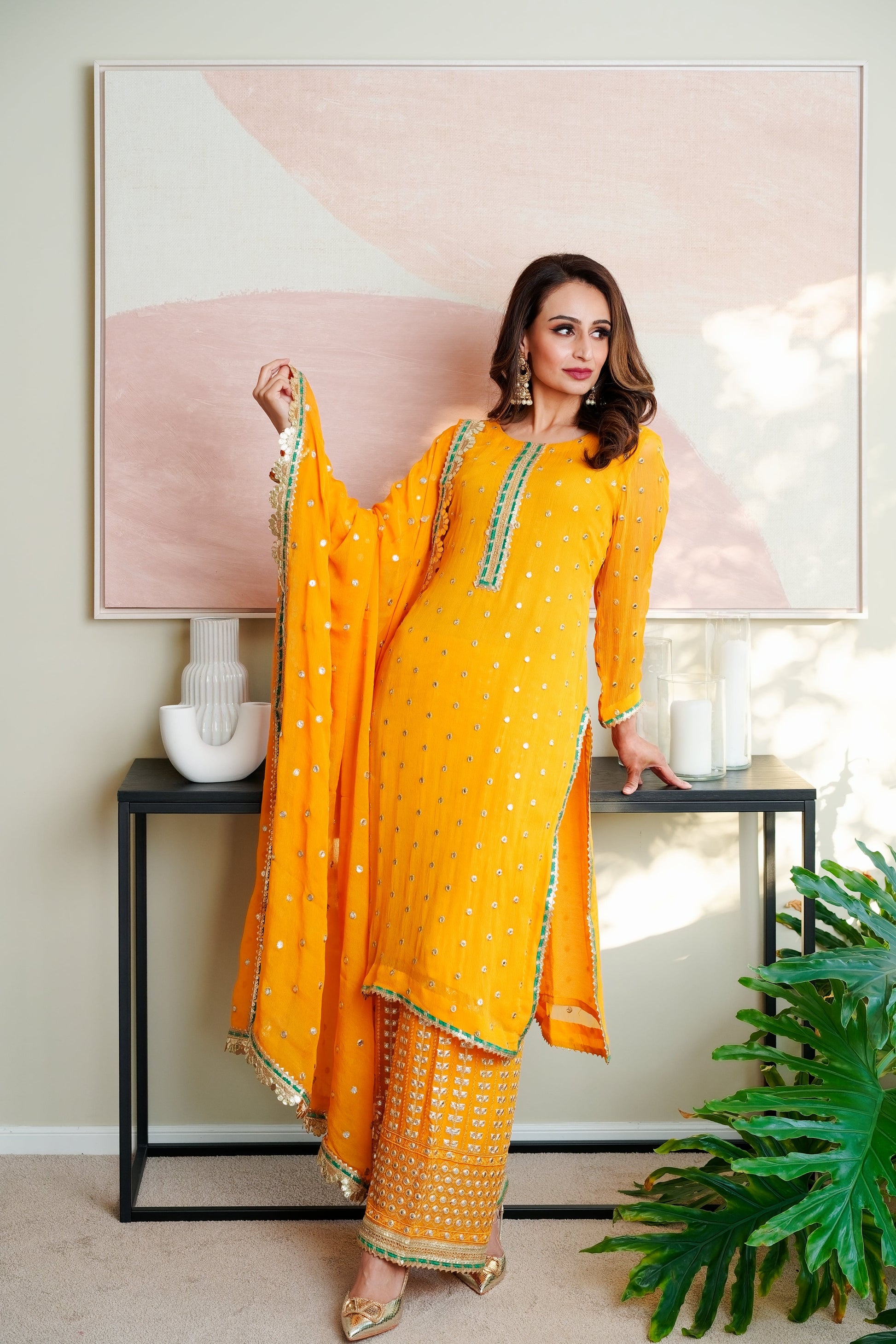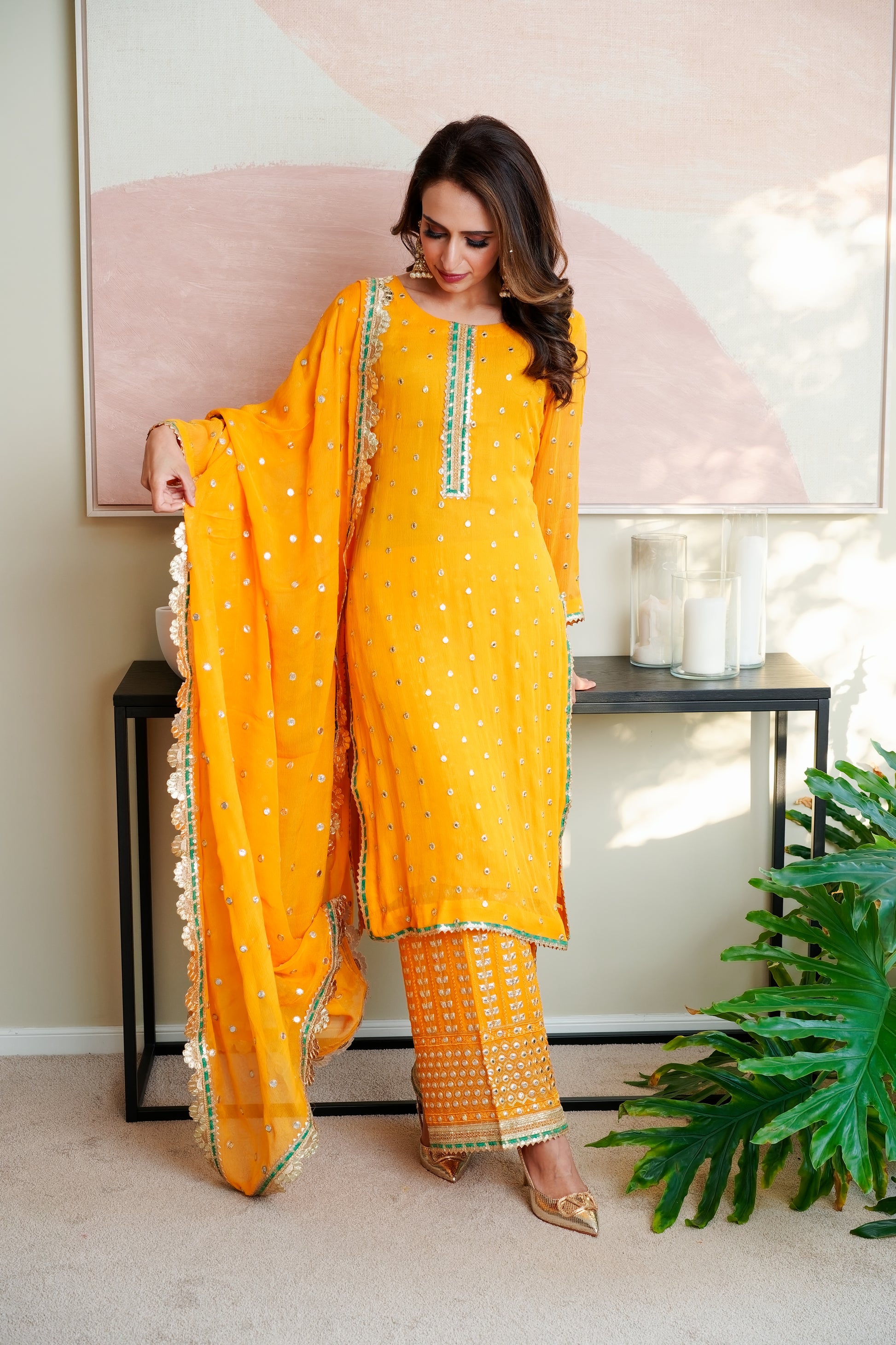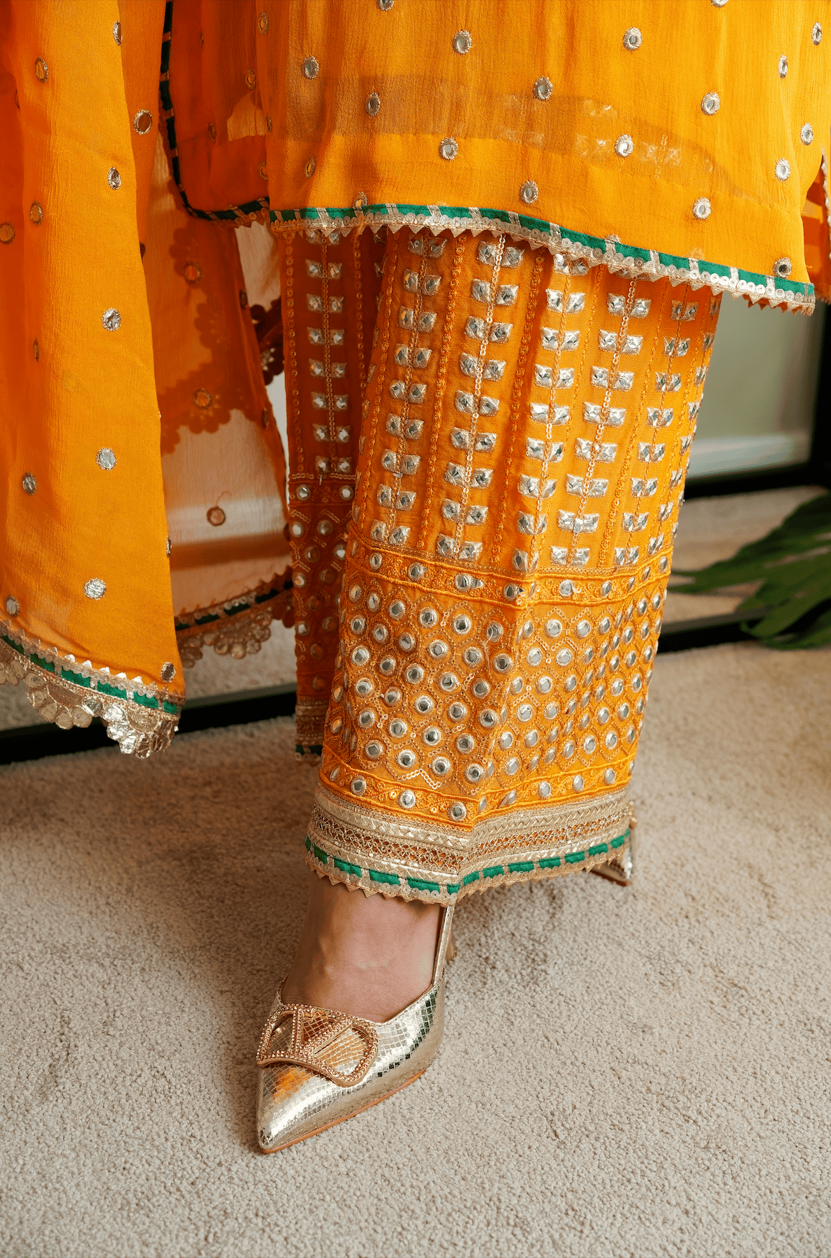 Be it a mayoun, mehndi or any festive occasion to celebrate, this classic yellow chiffon ensemble will be your forever go-to outfit. A bright marigold base embellished with gota, zari and sequins gives it the perfect traditional feel. Emerald green detailing adds to the allure of the outfit.
