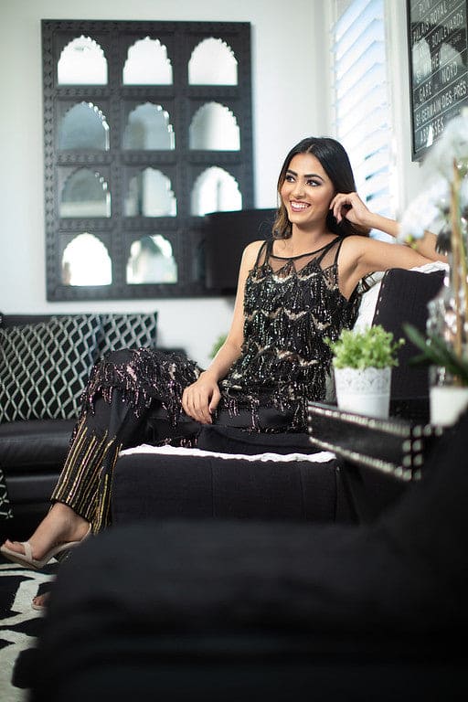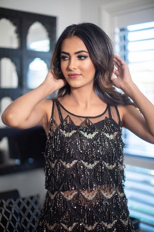 Turn heads in this net ensemble in a classic shade of black. Sprinkled with sequence and diamanté detailing, the stunning shirt is paired with a matching silk bootlegged trousers hand embellished with black and gold sequins. Perfect for a formal event or evening soiree, this ensemble is a wardrobe must have.