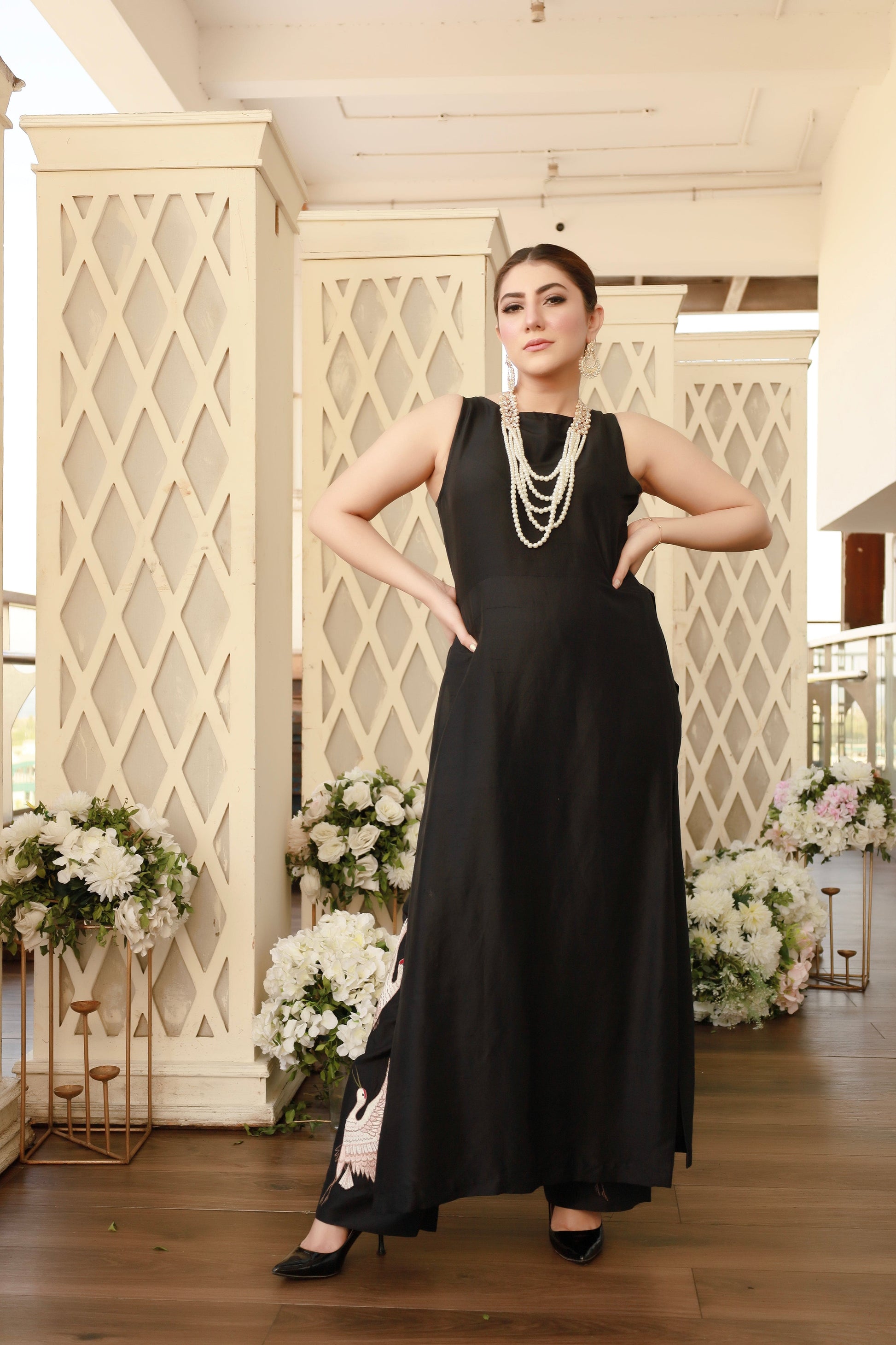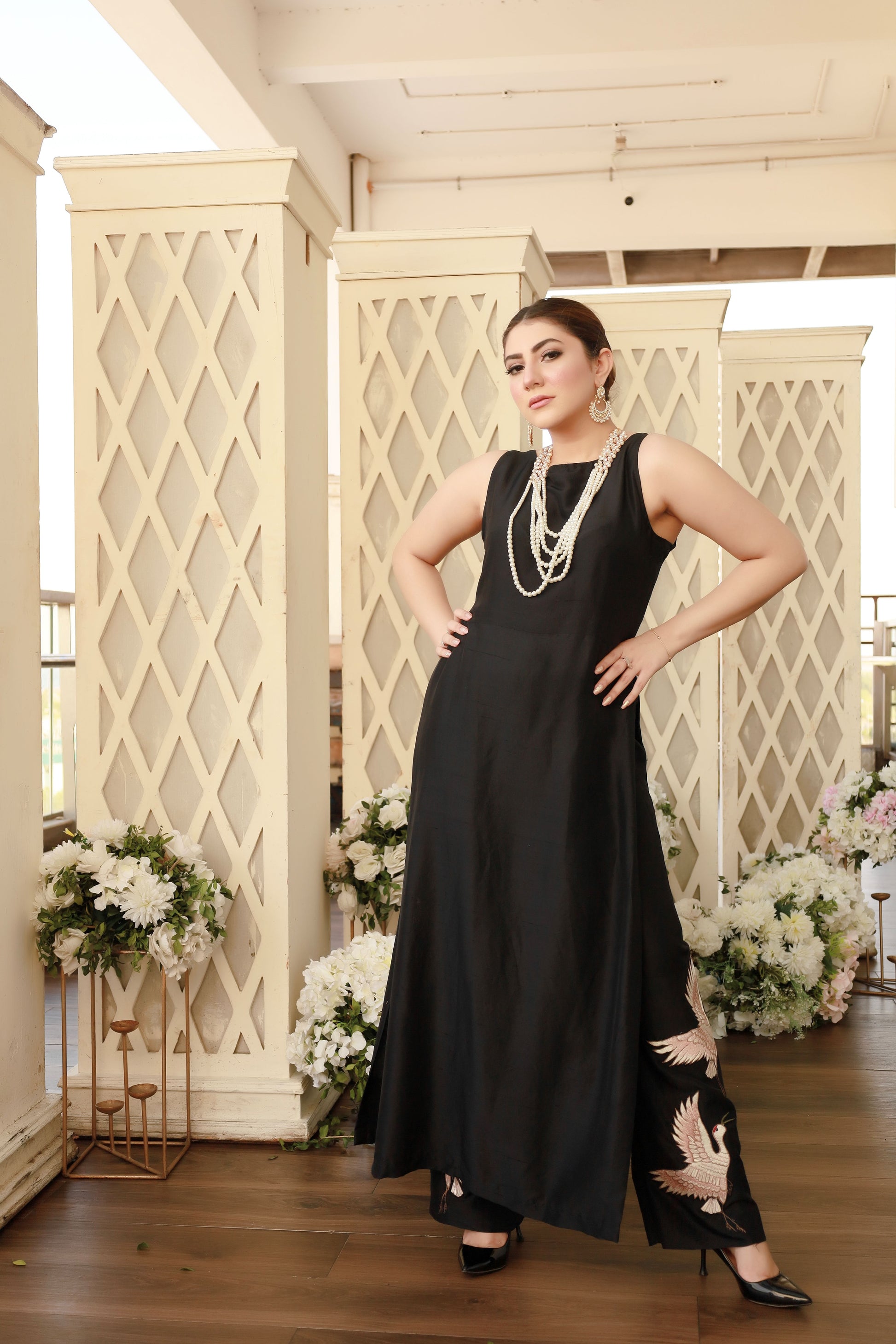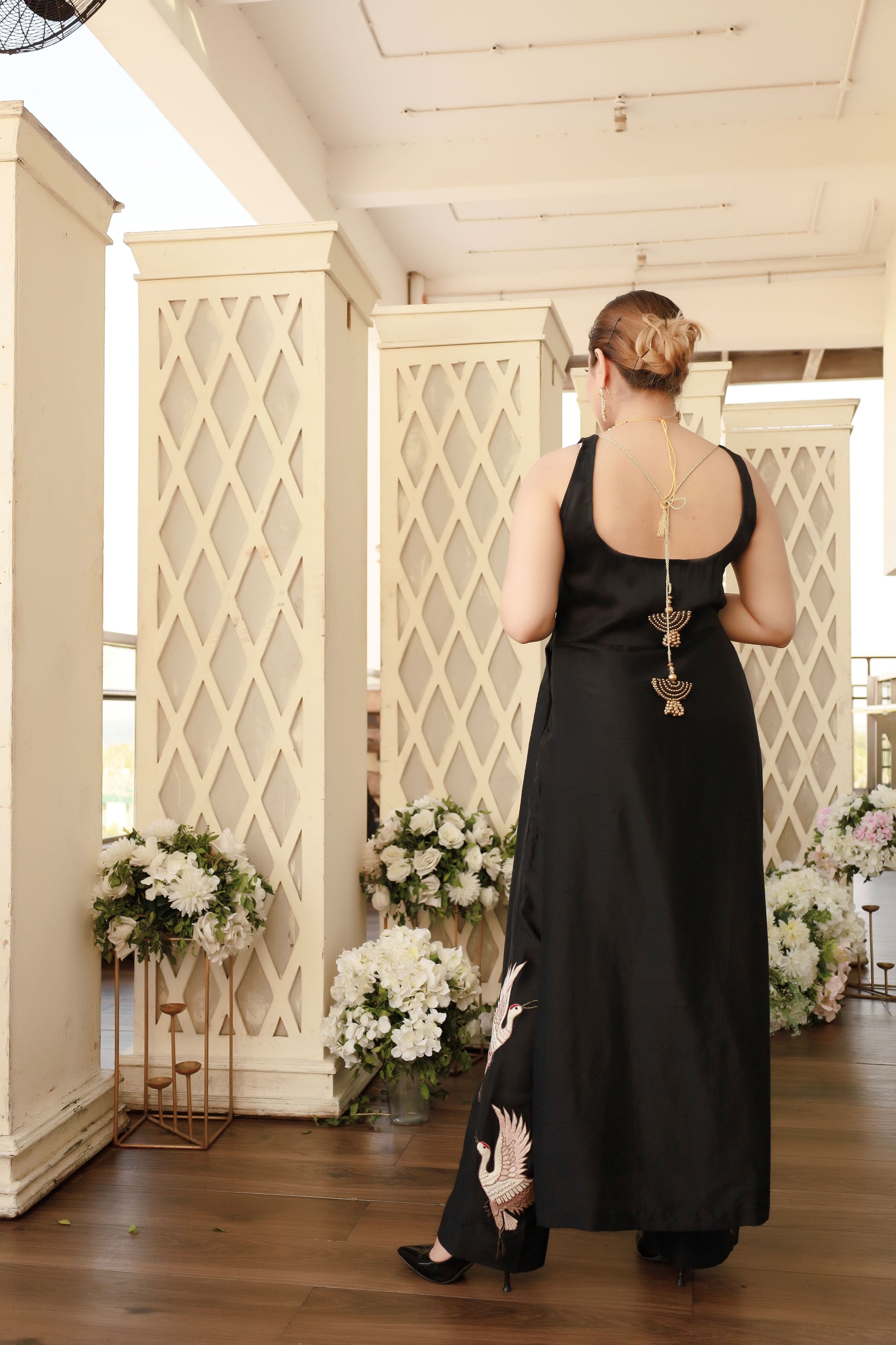 Be an epitome of elegance with our birdie ensemble. Cut from silk the impeccable tailoring and flattering silhouette of this ensemble will have you reaching for it whenever you really want to make an impact. The statement pants featuring embellished swans complete the look, perfect for an evening soiree. Pair yours with classic pearls and black heels!