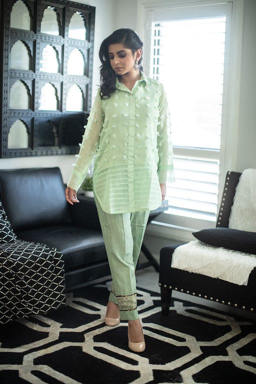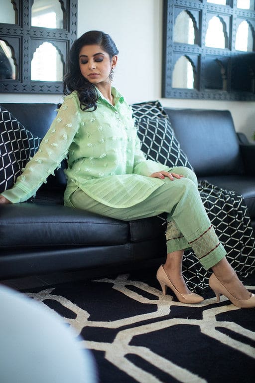 Cut from the finest cotton, this spearmint green co-ord set is the perfect addition to your year-round casual wear wardrobe. The organza pleated daman and sleeves add uniqueness to this ensemble and the stylish silk pants complete the look.