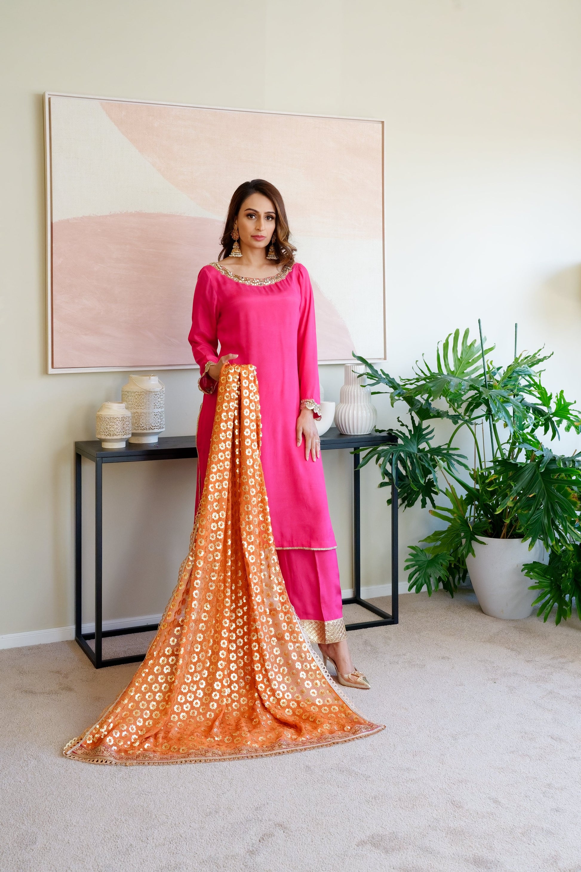 Get ready to be the centre of attention with this captivating ensemble featuring an abundance of signature Saffron details. The gorgeous fuchsia shirt has a universally flattering neckline and sleeves with mirror work and the burnt orange chiffon dupatta is heavily embellished with sitara and resham embroidery. Pair yours with matching culottes with gold detailing and some fun earrings to steal the show with effortless style!